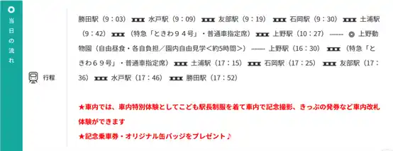 | (4)旅行代金:勝田駅・水戸駅発着・・・大人1名様 10,000円 こども1名様 6,800円 | ||||||||||