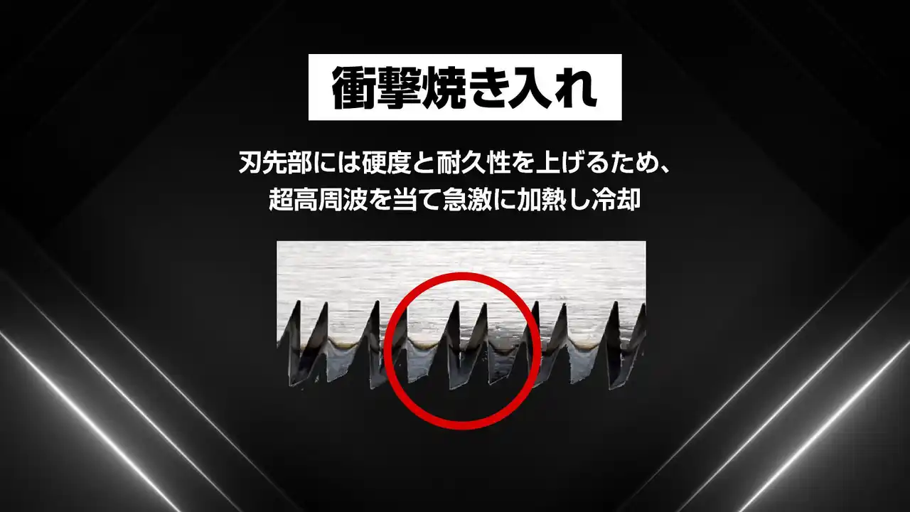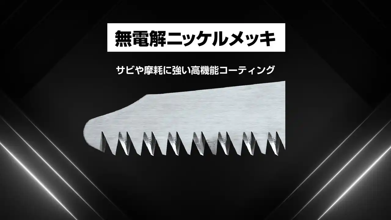全モデル共通の特長として、刃先の表面硬度を高め、耐久性と切削スピード向上に寄与する「衝撃焼き入れ」と、生木や竹など水分を含んだ鋸屑の付着による錆を抑え、保管時も扱いやすい「無電解ニッケルメッキ」を採用しています。 |