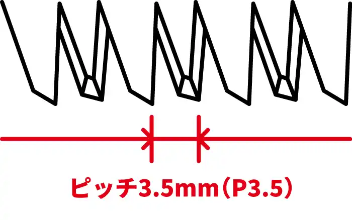 木工用ブレードより大きいピッチ3.5mm※を採用し、鋸屑の排出性を高めることで、生木や太枝の切断に適した仕様としました。さらに刃厚1.2mmにより、立ち木切断時の負荷がかかった状態でも曲がりにくく、力強く切り進めやすい設計です。 |