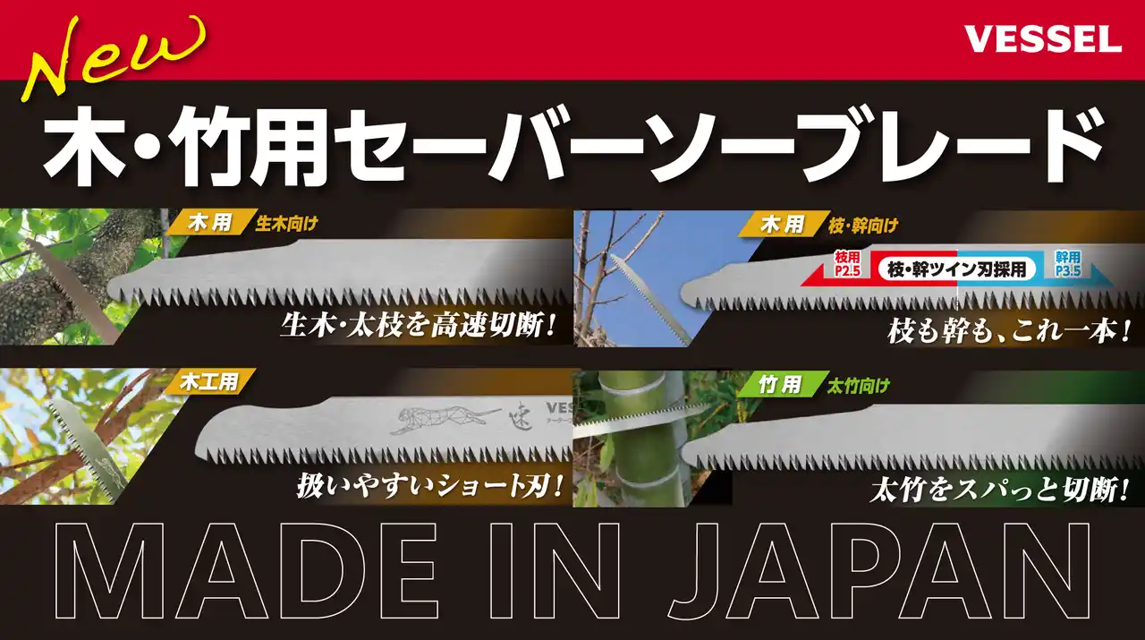 株式会社ベッセル(本社:大阪府大阪市東成区、代表取締役社長:田口雄一)は、木用/竹用セーバーソーブレードシリーズに4種を追加し、2026年4月2日より出荷開始します。今回追加するのは、「ライノブレード木用生木向け(SBRW-0830-1)」「ライノブレード木用枝・幹向け(SBDW-0830-1)」「チーターブレード木工用(SBW-1017-1)」「ライノブレード竹用太竹向け(SBRW-1030-1)」の4種です。既発売の2種と合わせ、木用・竹用は全6種のラインアップとなります。 |