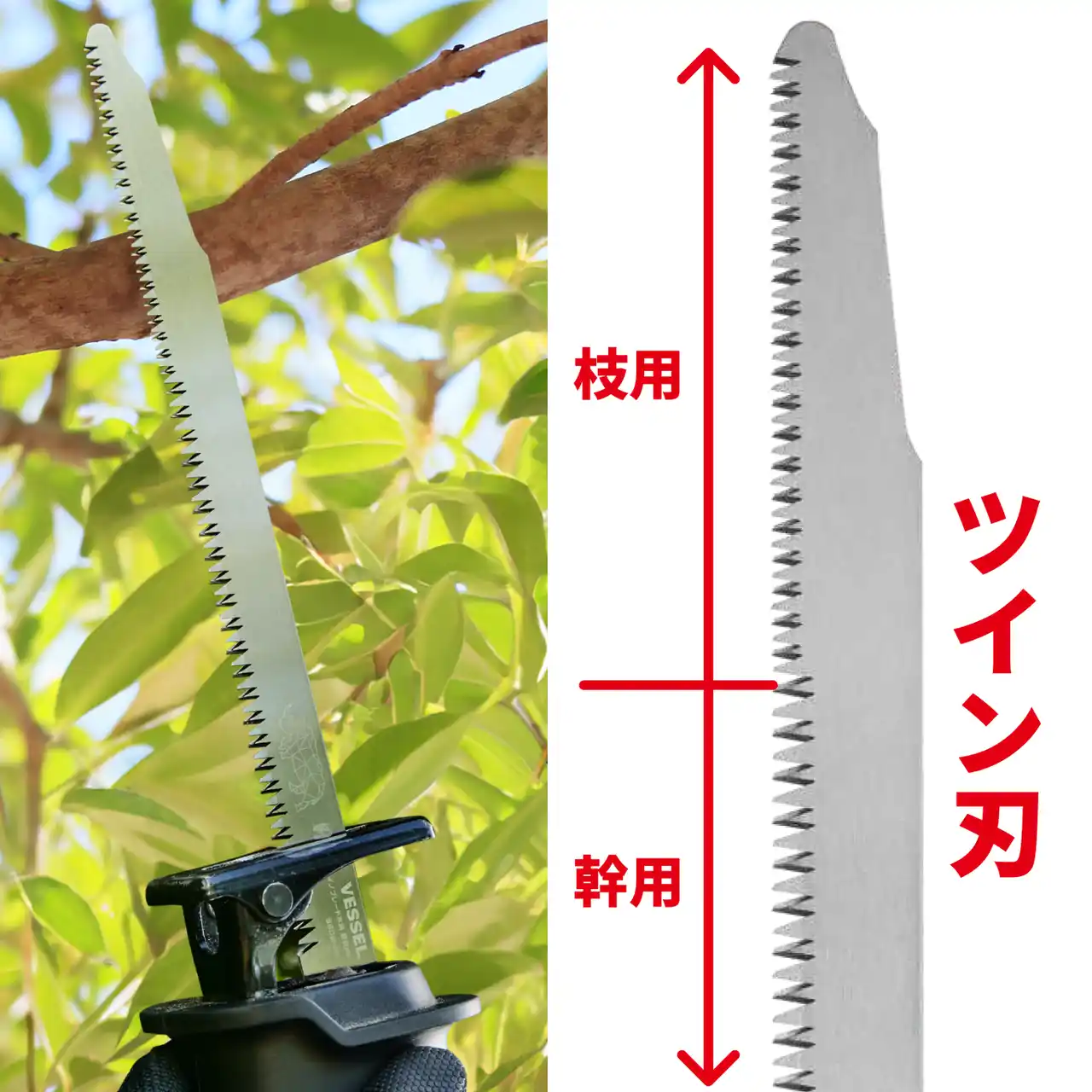 先端側ピッチ2.5mm、根元側ピッチ3.5mm※の「枝・幹ツイン刃」を採用。細枝への切り入りやすさと、大径材の切断スピードを1本で使い分けやすく、枝払いから幹切り、小間切り、庭木の剪定、リフォーム解体まで、作業の流れに合わせて使いやすい設計です。ブレード交換の手間を減らし、作業効率向上に貢献します。 |