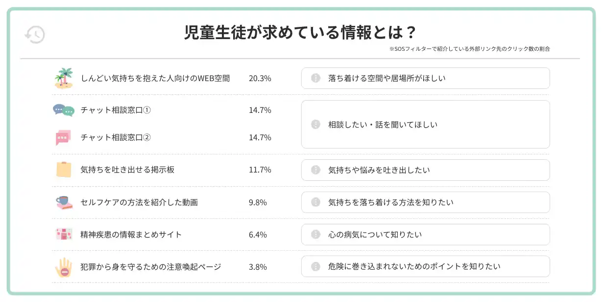 また、SOSフィルターが表示され、外部リンクをクリックしたユーザーのうち、20.3%が「しんどい気持ちを抱えた人向けのWEB空間」、14.7%が「チャット相談窓口」、11.7%が「気持ちを吐き出せる掲示板」を利用していることが分かりました。 |