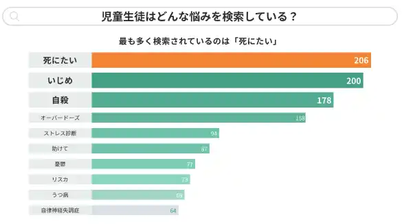 検索したキーワード別のデータからは、「死にたい」「いじめ」「自殺」といった言葉が上位を占めていることが分かります。その他、「オーバードーズ」「助けて」「リスカ」「うつ病」「自律神経失調症」といった言葉が多く検索されています。 |