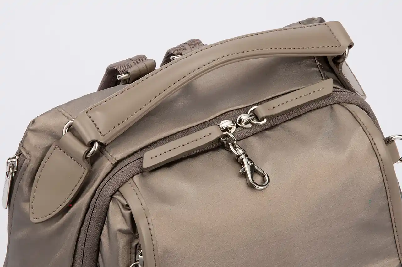 メイン収納部のファスナーに、不用意な開閉を防ぐセーフティーロックを配置。 |