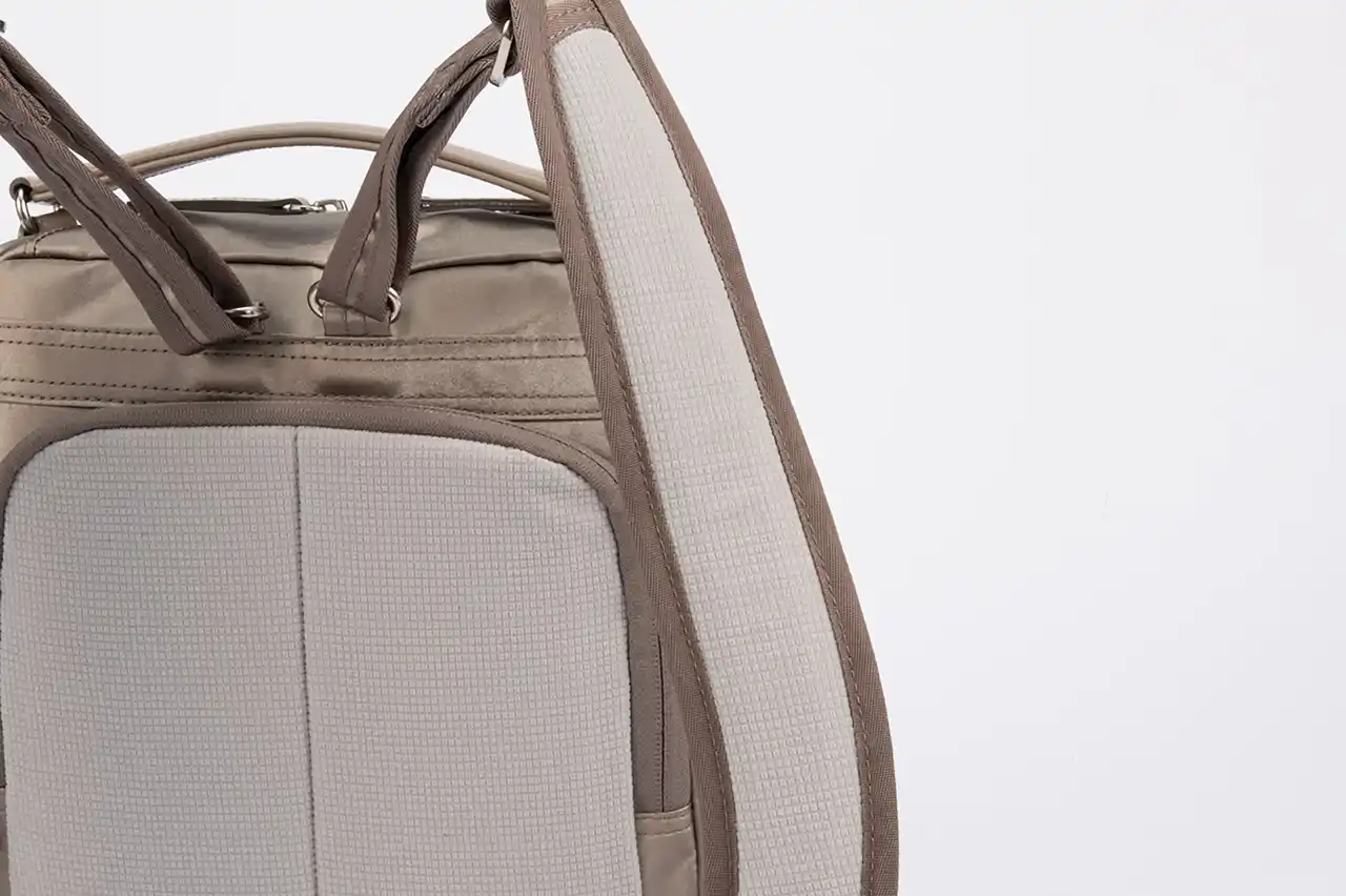 肩ベルトは、体型に合わせてクッションパッドの位置を変えられる調整金具を上下2箇所に配置しました。 |