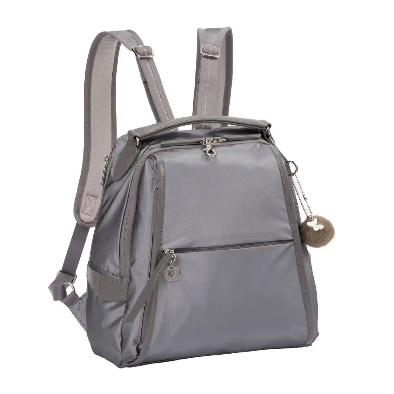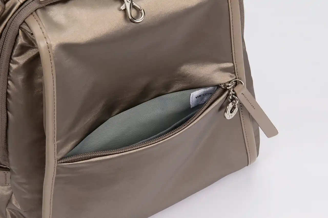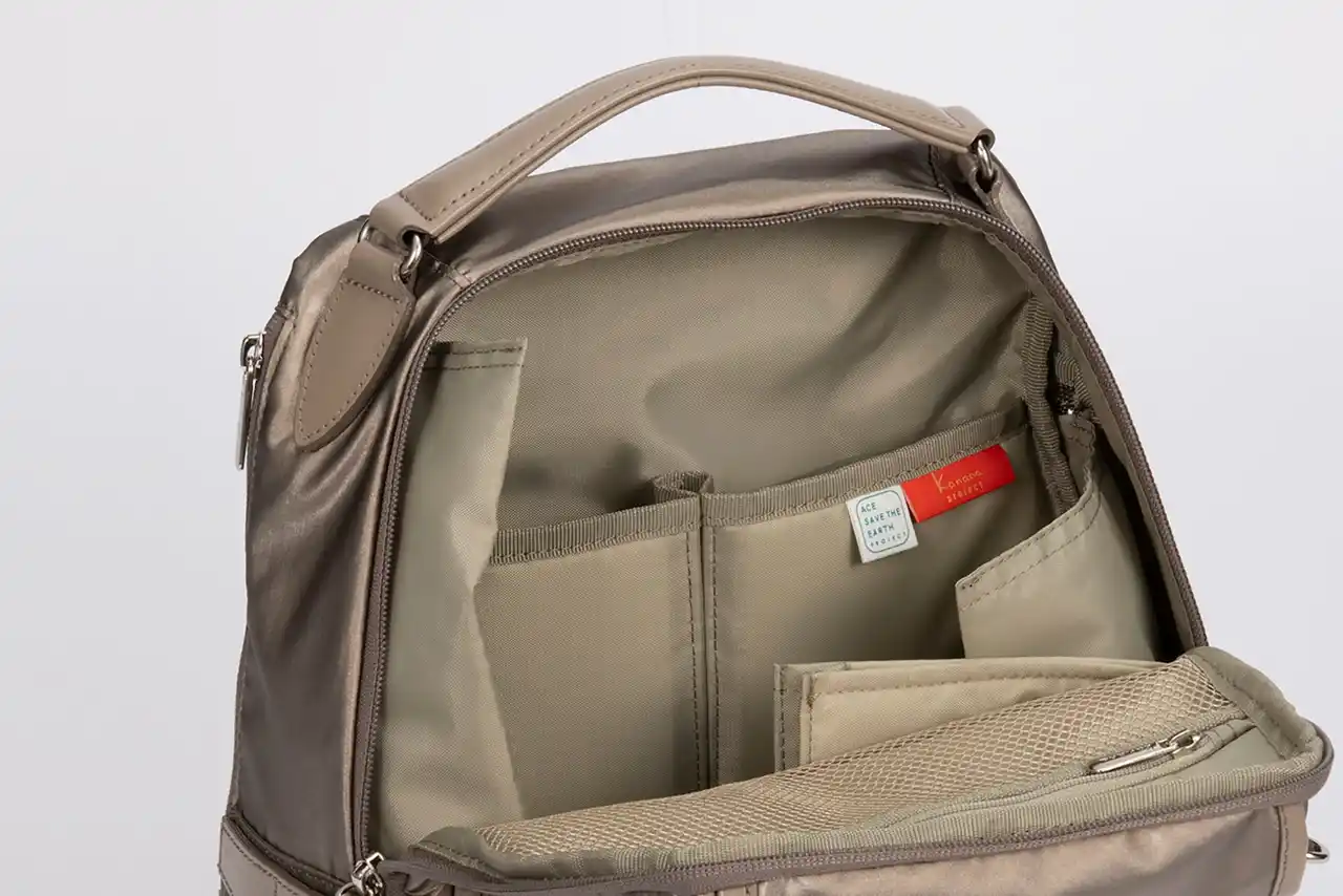 本体に、どんな装いにも馴染むナチュラルな光沢感のあるマテリアルを採用し、華やかな印象に仕上げています。小物を整理しやすい充実のポケットや、安心して背負えるセーフティーロック付きのファスナー、暑い季節に嬉しい吸水速乾生地など、快適な機能を備えます。 |