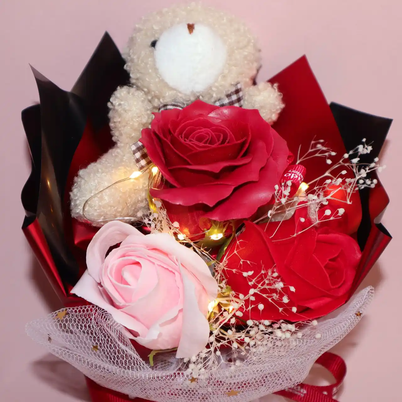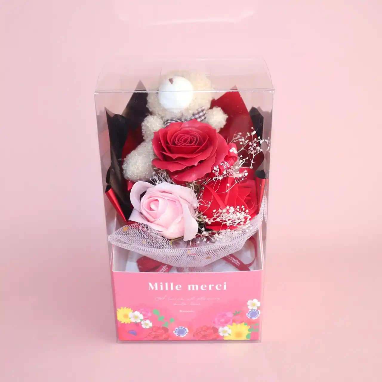 karendoで通年人気のベアシリーズから、コラボ限定デザインが登場。ブーケの中にLEDライトを内蔵しており、ボタンを押すと優しく光る仕様となっています。お相手の驚く顔を想像するだけでも楽しい仕掛けとなり、サプライズギフトとしてピッタリです。観賞用のため、お手入れ不要でインテリアとして長期間楽しんでいただけます。背面には総柄のグラフィックを施し、コラボならではのカラフルで華やかな世界感を表現しながら、正面からはお花の美しさが際立つデザインに仕上げました。今年の母の日が素敵な思い出になりますように。 |