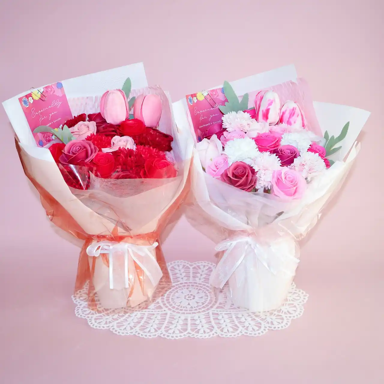 ピンク・赤・ホワイトの小さなバラのつぼみを、花束のように仕立てた母の日限定の特別なチョコレート。箱を開けた瞬間、その華やかさに思わず「こんなチョコレート見たことない!」と驚きと感動が広がります。エネルギーを象徴する赤はイチゴ、優しさを象徴するピンクはラズベリーで表現し、ホワイトチョコでやわらかな印象に仕上げました。果汁をたっぷり使用した、濃厚な6種類の味わいを詰め込んだ特別なチョコレートの花束。見た目の美しさと味わいを兼ね備えた、飾っても食べても楽しいアートスイーツを、日頃の感謝の気持ちを込めて贈りませんか? |