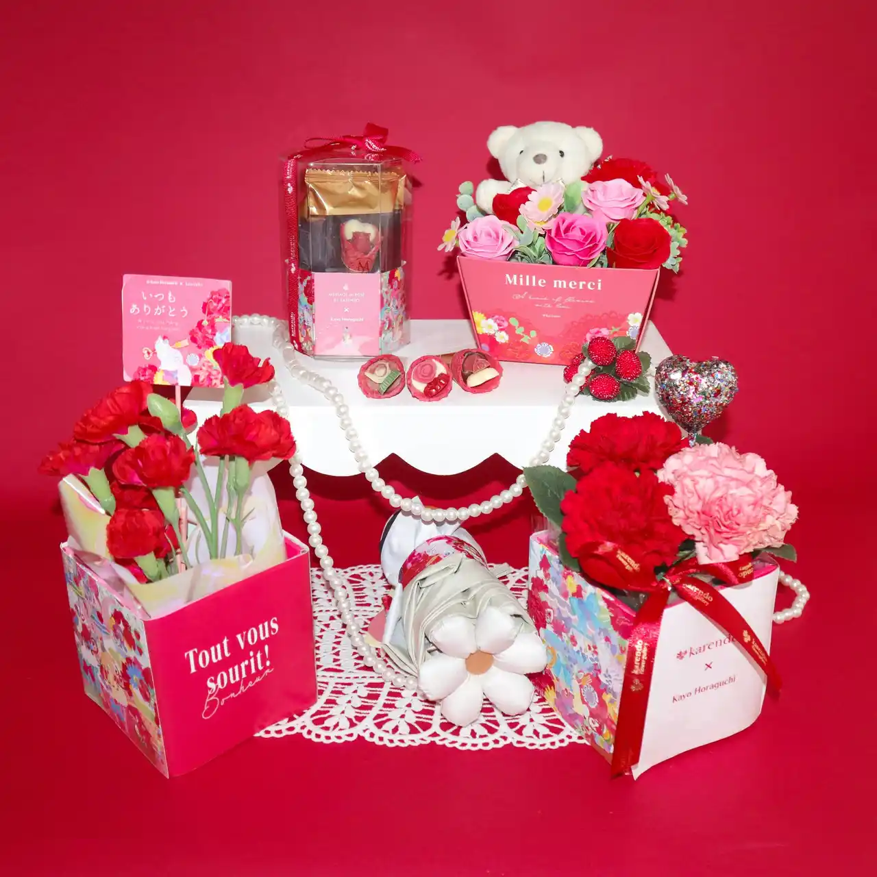 メインビジュアルには、karendoの人気スイーツや、カラフルなガーベラやカーネーションなどのモチーフを散りばめ、ホラグチカヨ氏の鮮やかなグラフィックで再現いただきました。本年は母の日(5月10日)に向けて、コラボ商品ラインナップを大幅に拡充。お花屋さんが作るチョコレートやソープフラワー、さらには傘など「こんなお花見たことない!」と、驚きと感動を届ける多彩なカテゴリーで展開します。 |