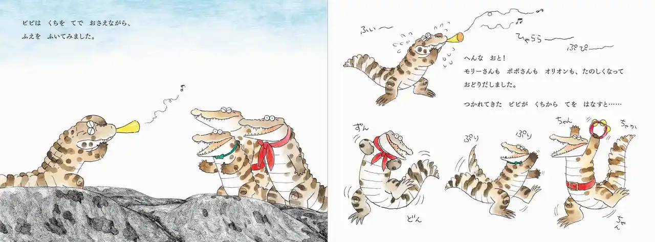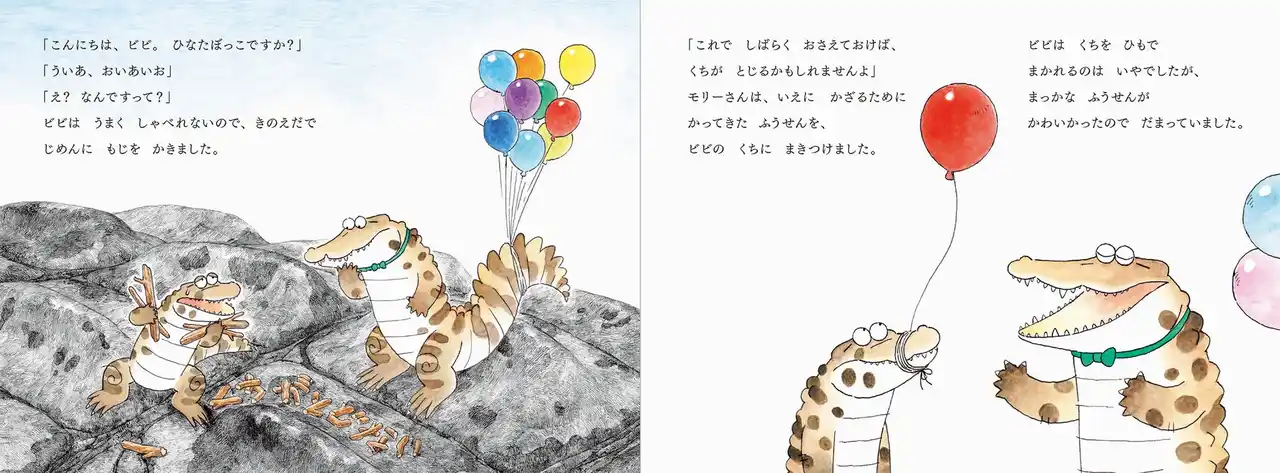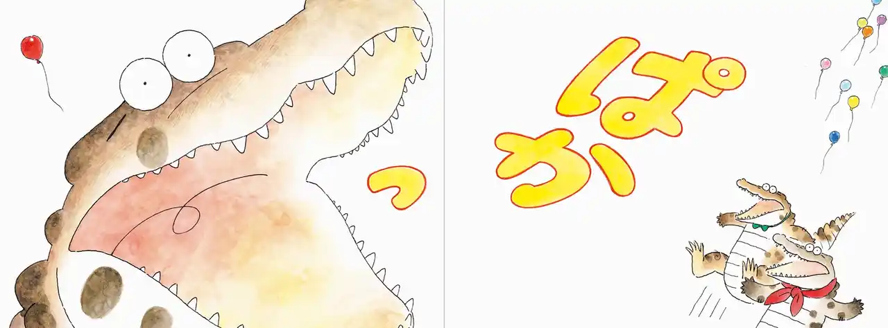 大きなあくびをしたワニのビビ。意識した途端、口の閉じ方がわからなくなりました。友達が助けようとしてくれますが、何をしてもぱかっと開いてしまいます。かわいらしいキャラクターと繊細なタッチの絵が融合した、ワニの魅力がつまった絵本。 |
