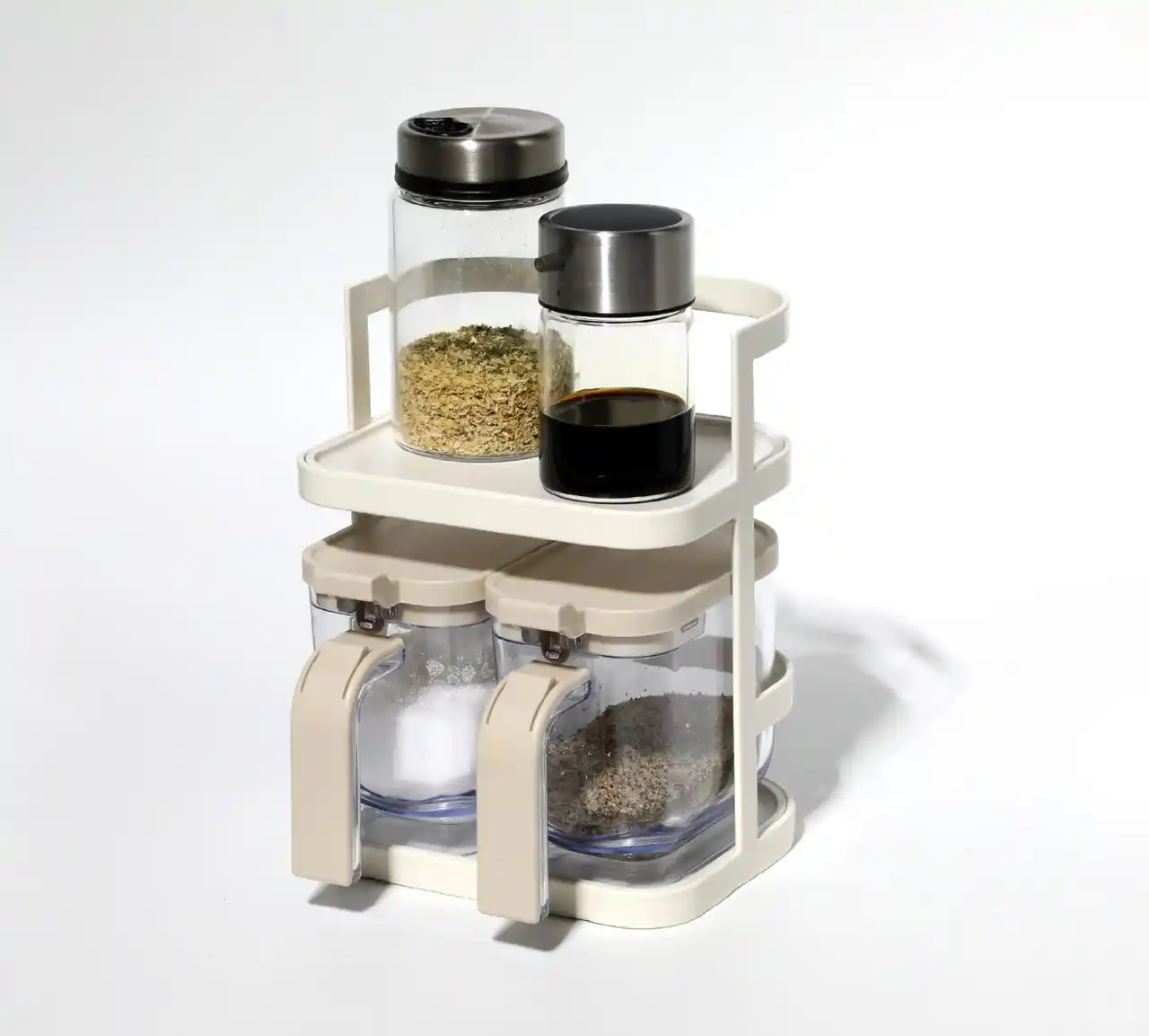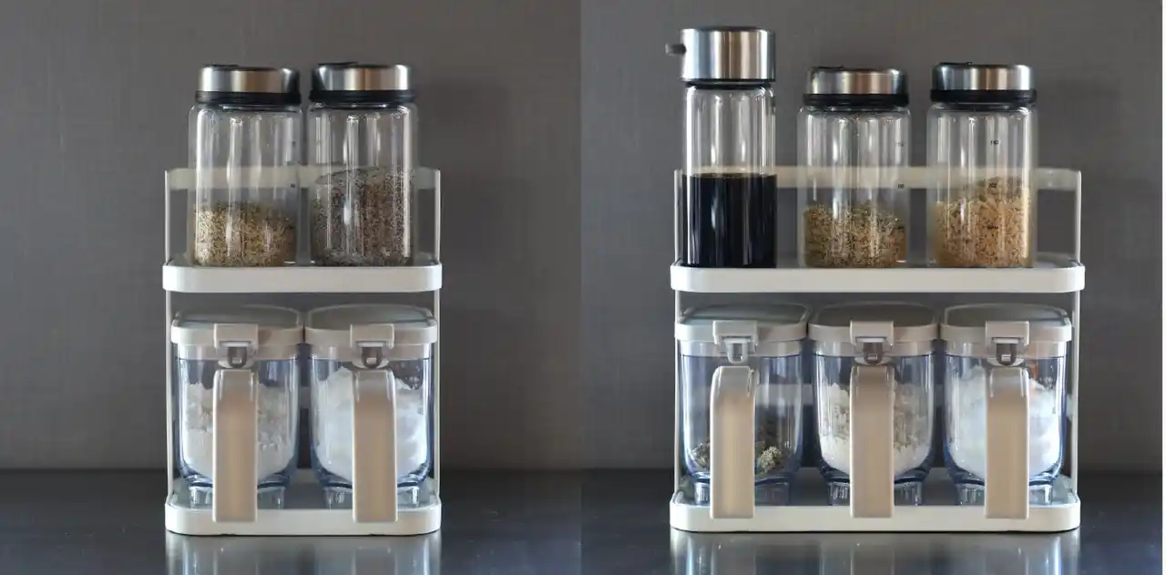 2段にすることで、調味料が上下に整理され、どこに何があるかがひと目で分かるように。 |