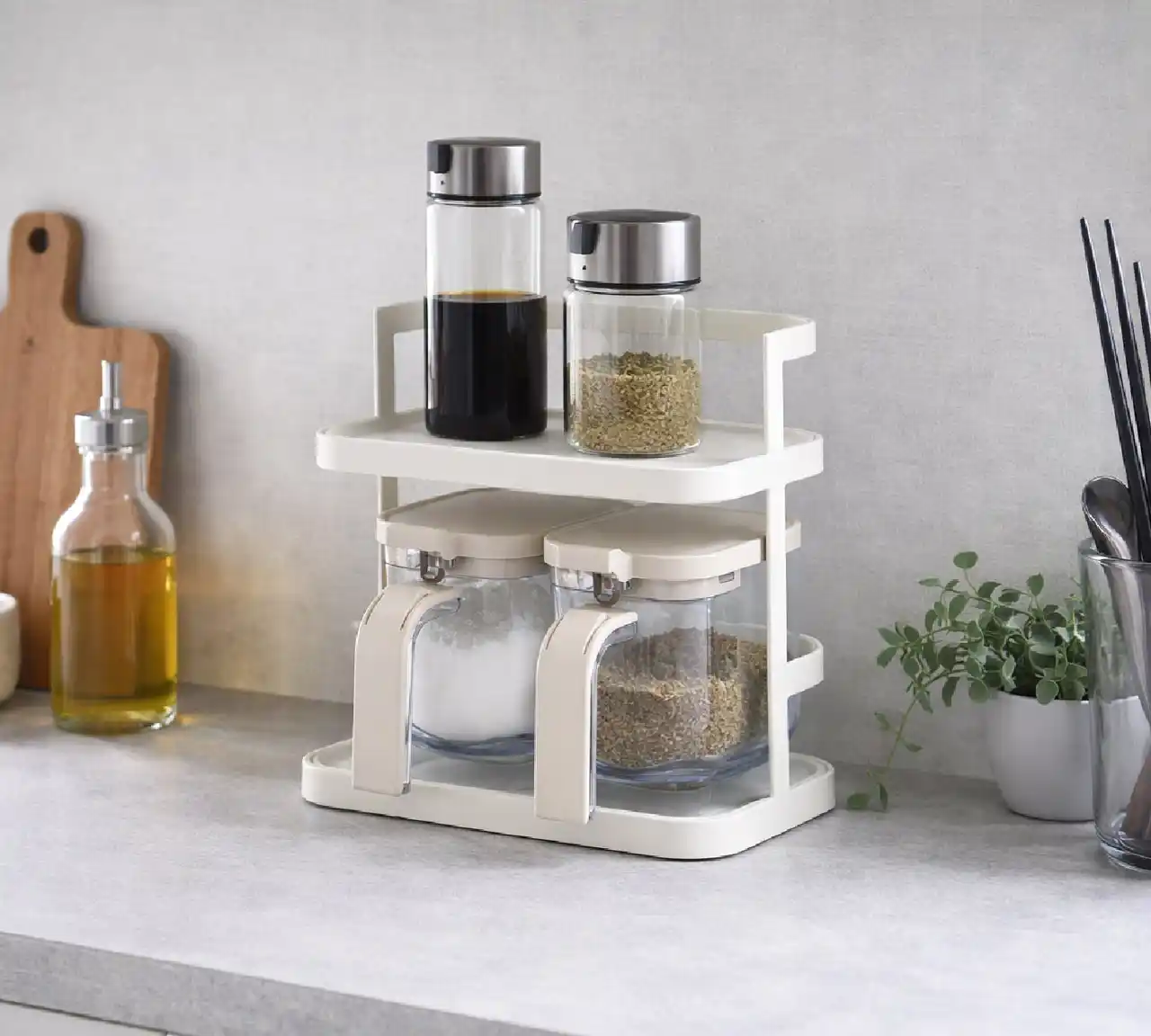 上段・下段に分けて収納できる2段仕様。スリムは4個、ワイドは6個の調味料ポットをまとめて置けます。バラバラになりがちな調味料に “定位置”ができることで