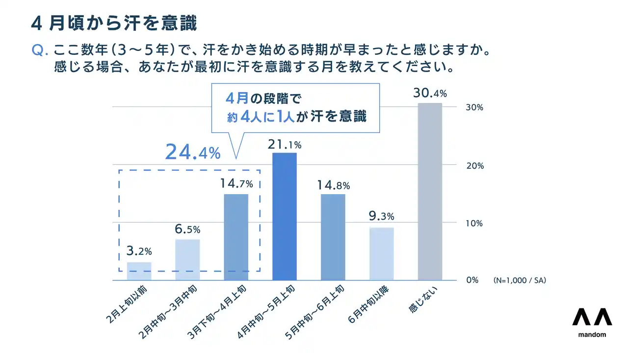 約7割が汗をかき始める時期が早まったと実感。「4月」の段階で既に約4人に1人が汗を意識。 |