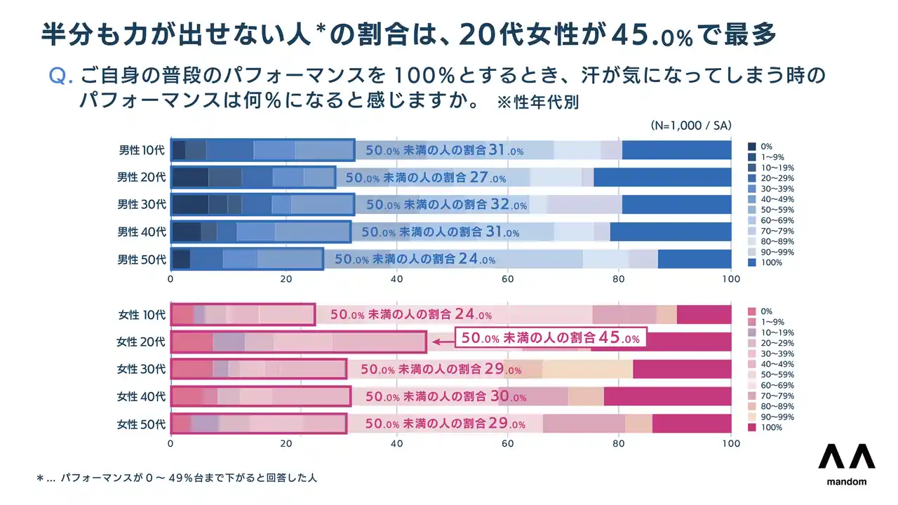 3.8割以上が汗によるパフォーマンスの低下を実感。20代女性の約2人に1人が「本来の力の半分も出せない」と回答。