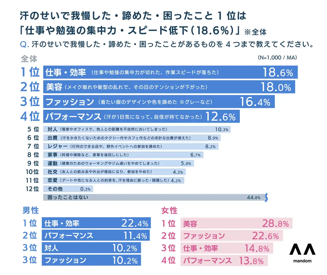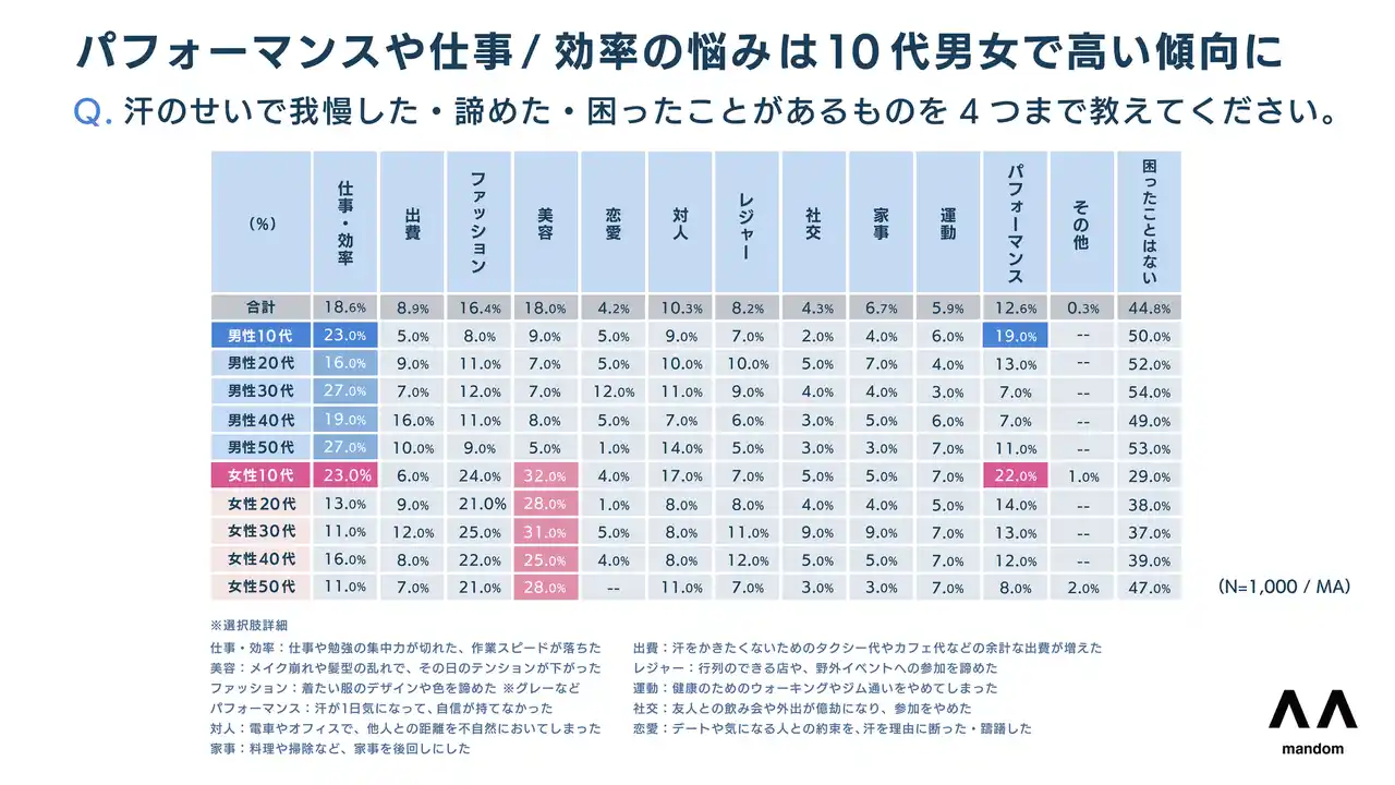 株式会社マンダムは、生活者の汗に関連するお悩みの解消をサポートするため、10~50代の男女1,000名を対象に「汗とにおいに関する意識調査」を実施しました。 |