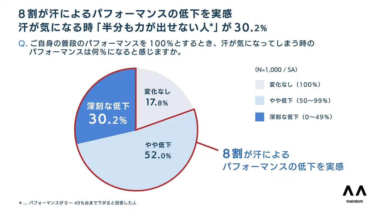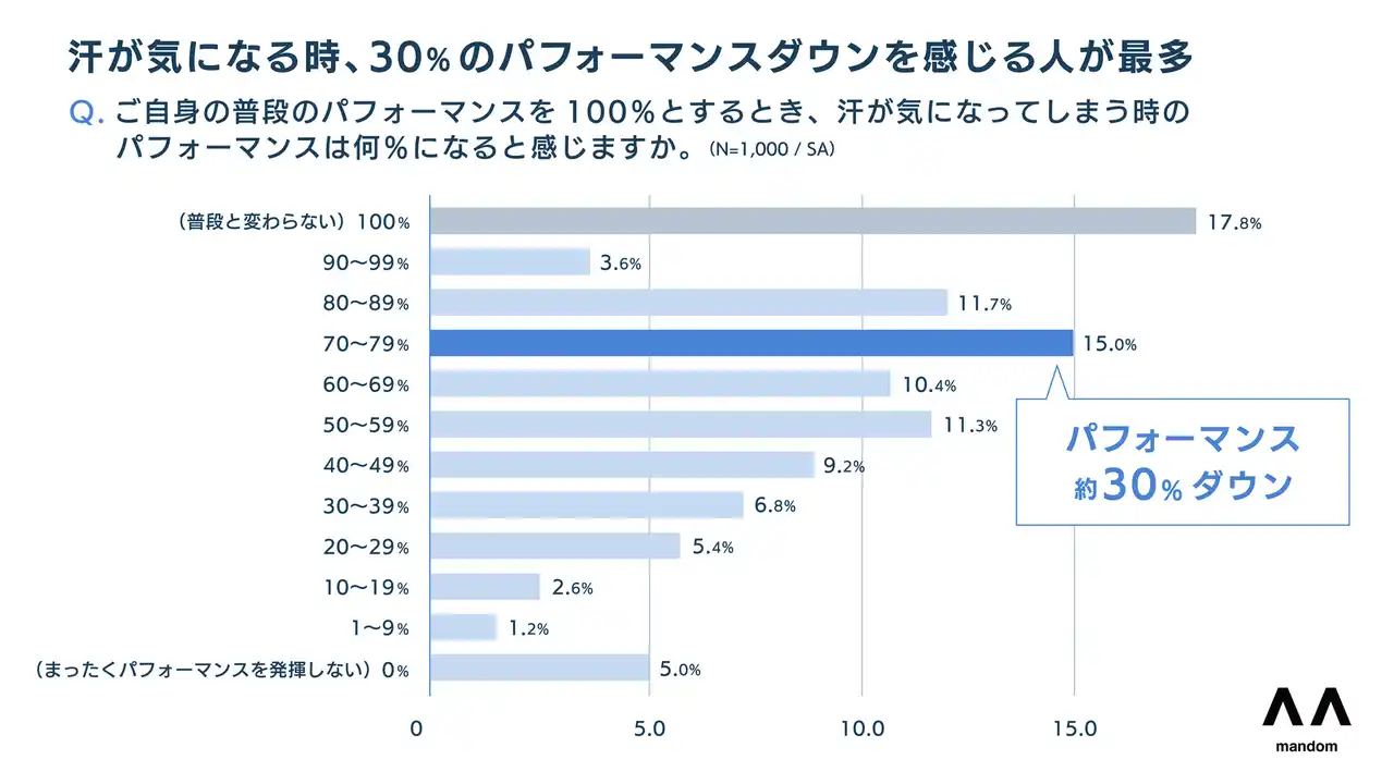 8割以上が汗によるパフォーマンスの低下を実感。パフォーマンス3割ダウンが最多。 |