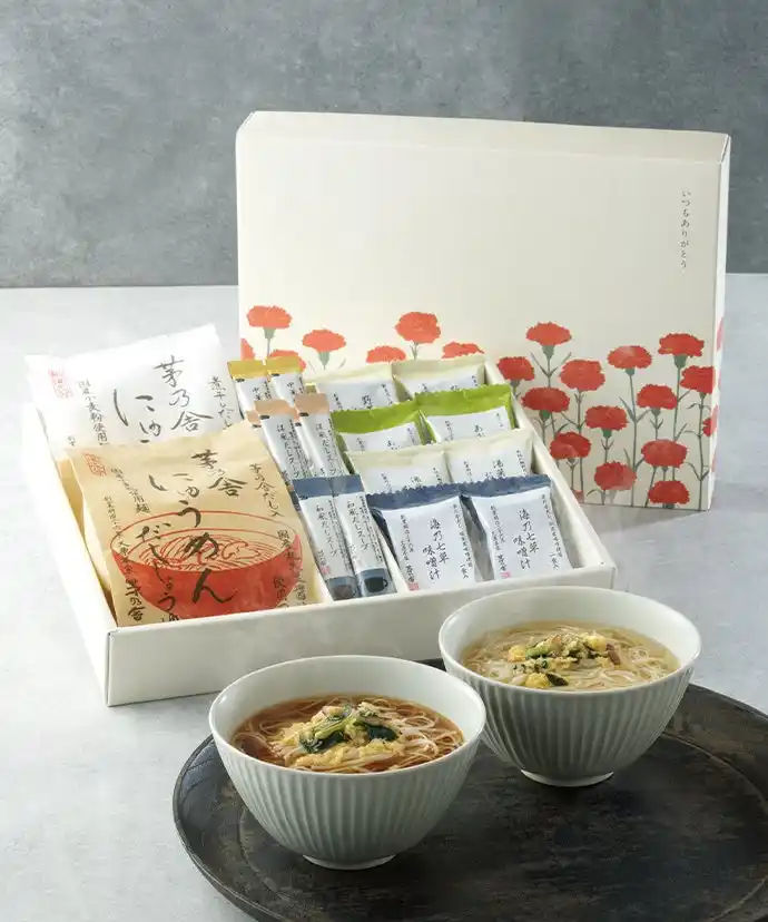 ■母の日限定 にゅうめん・フリーズドライ味噌汁・だしスープギフト お湯を注ぐだけのフリーズドライ味噌汁やにゅうめん、だしスープを母の日限定パッケージに詰め合わせました。 |