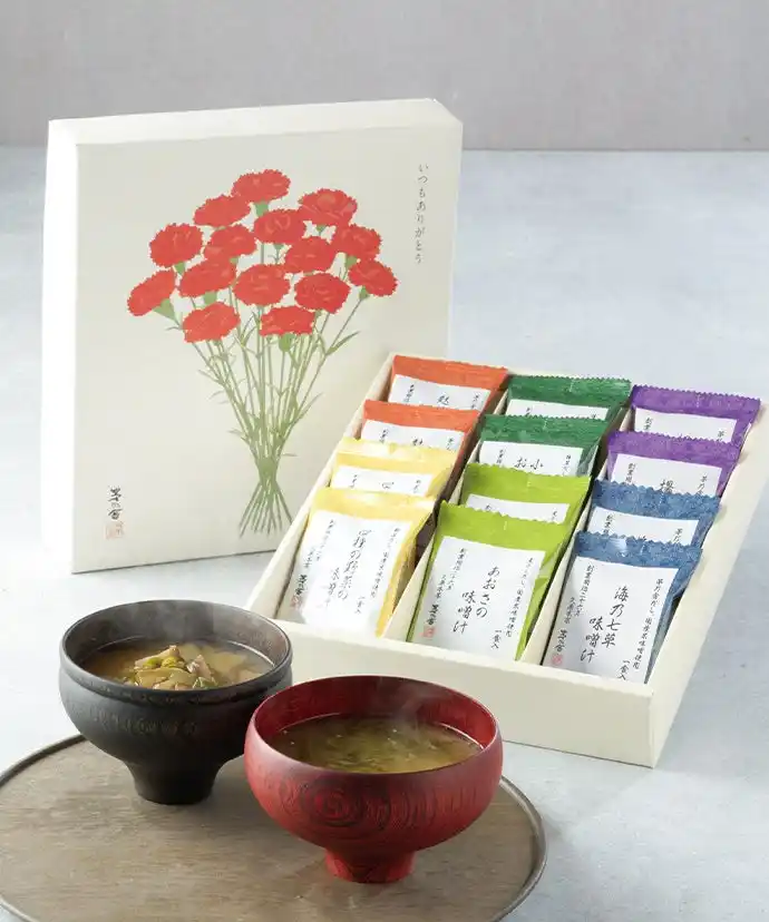 人気のお湯をかけるだけのフリーズドライ味噌汁を、母の日限定箱に詰め合わせました。 |
