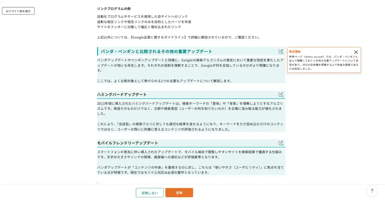 | AIが修正した箇所について、「どの見出しが変更されたか」「なぜその修正を行ったか」の理由をアイコンから確認できるようになりました。AIの判断根拠が明確になることで、「AIの提案が正しいのか不安で、結局全箇所を細かくチェックしてしまう」といった心理的ハードルを解消します。 | |||||||||