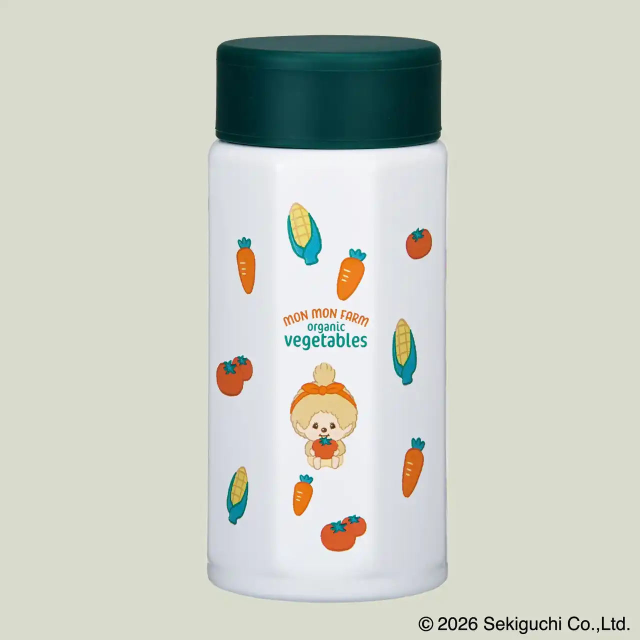 ボトル本体には、「モンチッチ」たちがニンジンやトウモロコシ、トマトなどの野菜に囲まれている様子が描かれています。 |
