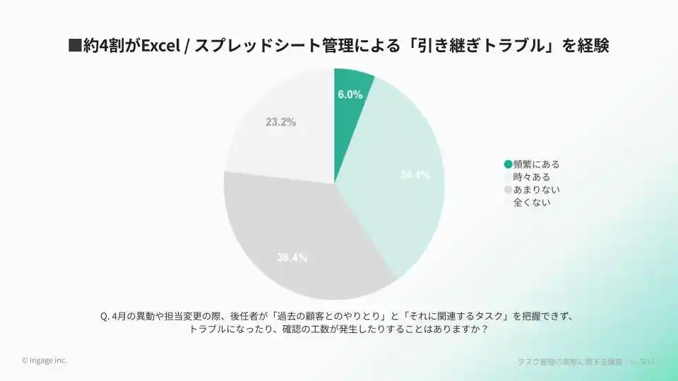 コミュニケーションプラットフォ-ム「Re:lation(リレーション)」を提供し、6,000社以上(※1)の導入実績を誇る株式会社インゲージ(本社:大阪府大阪市、代表取締役社長:和田 哲也)は、日常的にメールとタスク管理表(Excel / スプレッドシート等)を併用しているビジネスパーソン500名を対象に、「タスク管理の実態に関する調査」を実施いたしました。 |