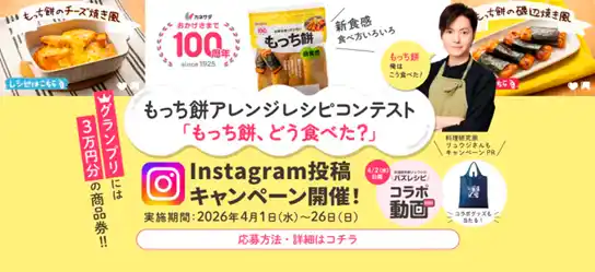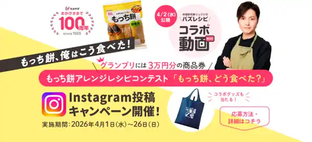 また、これに連動して、Instagramにて「もっち餅」を使用したアイデアレシピコンテストを開催します。「もっち餅」を使った多彩なアレンジレシピを募集し、応募作品の中から選ばれた受賞者には、商品券や「リュウジのバズレシピ×カネサダ」のオリジナルエコバッグなど豪華賞品をプレゼントします。 |