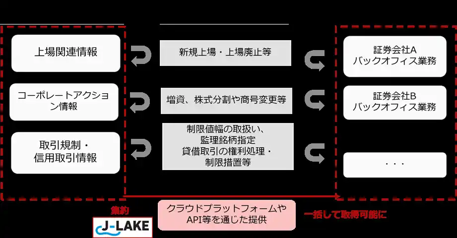 今般、本取組みの一環として、JPX総研および日本証券金融株式会社(以下、「日証金」)は、証券会社におけるバックオフィス業務の正確性及び効率性の向上を支援するため、企業・取引に関する各種情報を集約し、自動処理しやすい形式で配信する、業界横断的な共通データ基盤の構築にあたり、今後協働して検討を推進することについて合意いたしましたので、お知らせします。 |