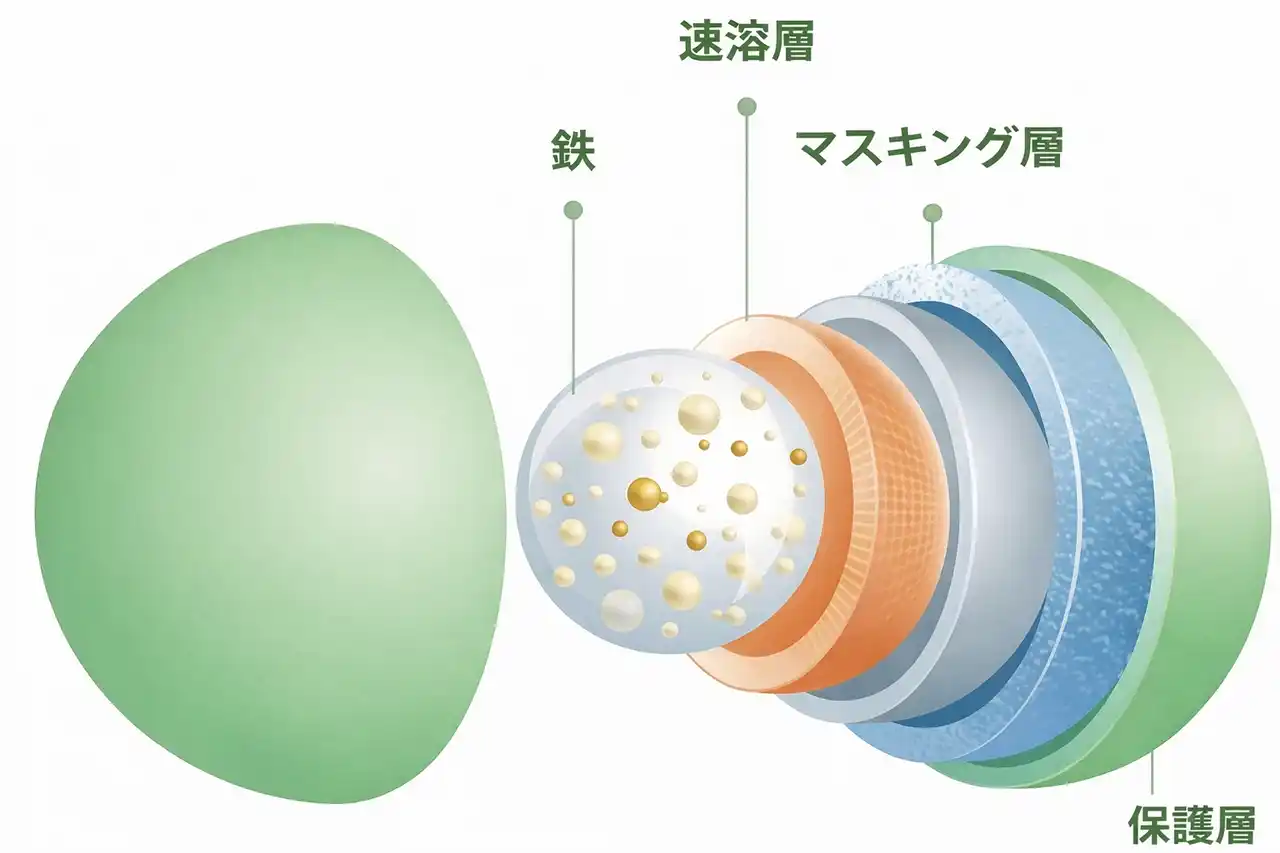 リポソーム加工された鉄が胃にさらされず、腸まで届くことで、不快症状を感じにくい設計です。 |