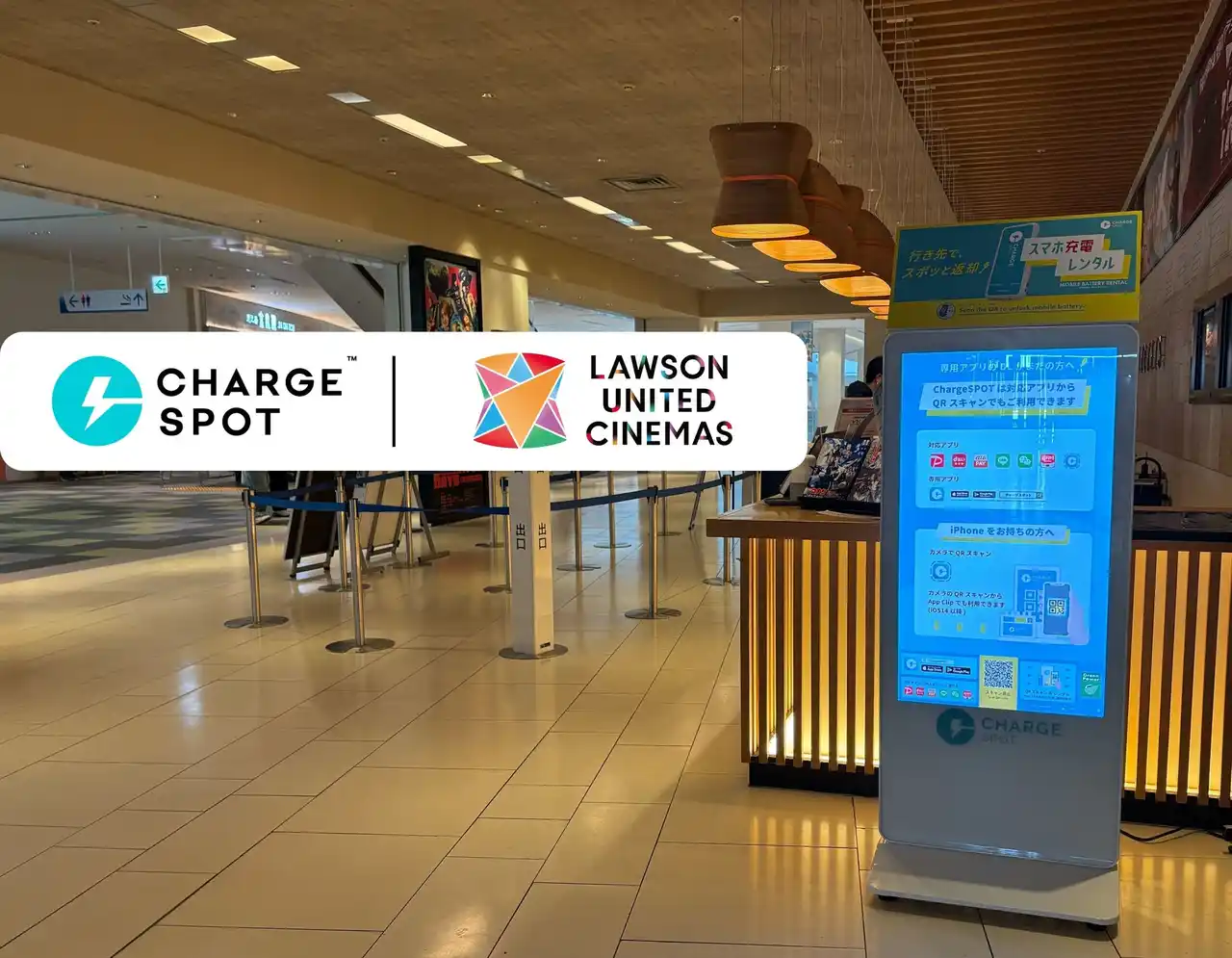 モバイルバッテリーのシェアリングサービス「CHARGESPOT(TM)(チャージスポット)」を運営する株式会社INFORICH(本社:東京都渋谷区、代表取締役 Group CEO:秋山 広宣、以下「INFORICH」)と株式会社ローソン・ユナイテッドシネマ(本社:東京都品川区大崎1丁目11番2号、代表取締役社長:清水 俊英、以下「ローソン・ユナイテッドシネマ」)は、全国のローソン・ユナイテッドシネマ38劇場に「CHARGESPOT」を2026年4月1日に設置完了いたしました。映画鑑賞を存分に楽しんでいただける充電環境の整備と、新たなユーザーのご利用促進を目的に両社が連携してまいります。 |