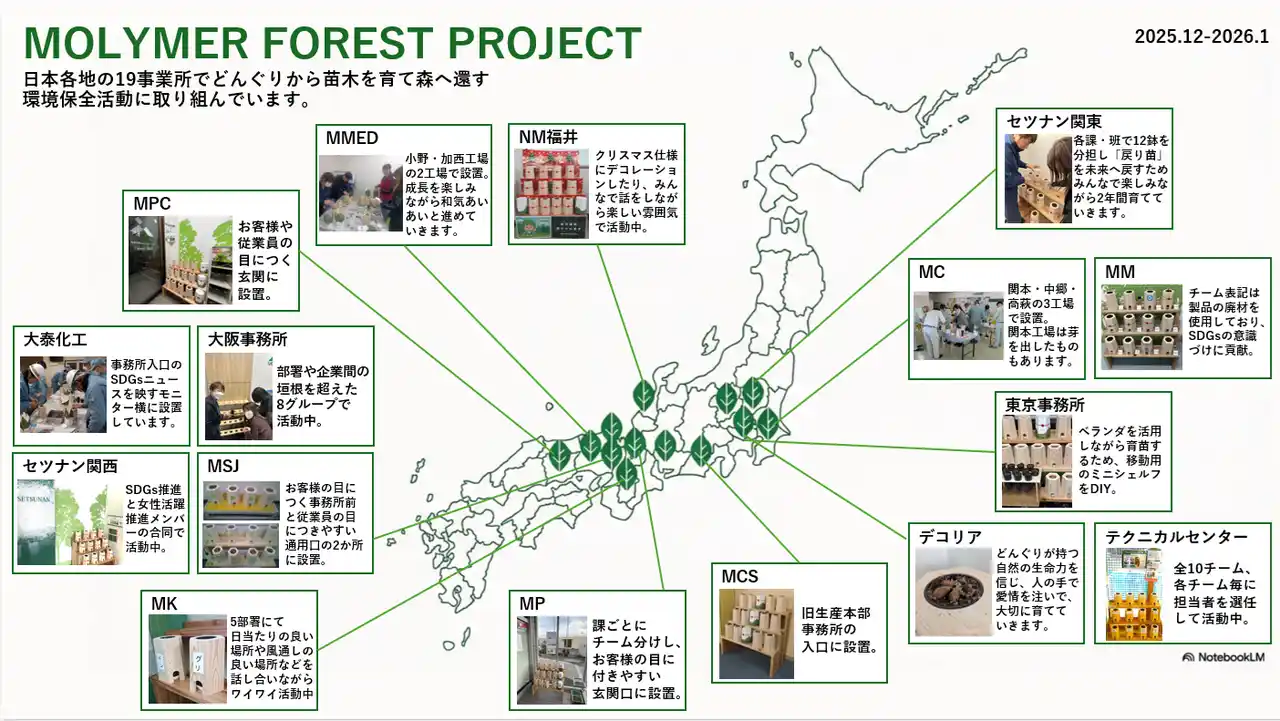 | 本プロジェクトは、モリマーグループのサステナビリティ活動の柱「MOLYMER FOREST PROJECT」として、グループ横断的に展開されます。全国の拠点をデジタルツールで繋ぎ、素材メーカーとしての源流である自然環境への貢献を目指します。 | |||||||||