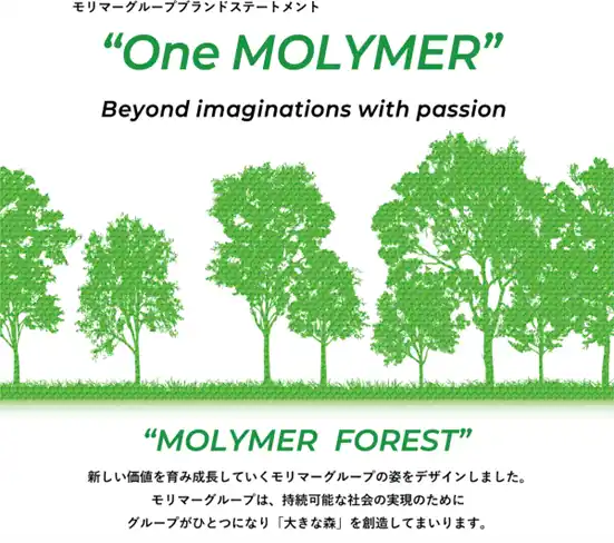 | その象徴として掲げたグループブランドステートメントが「One MOLYMER」です。グループがひとつとなり、社会に対して大きな「森」のような存在として貢献していく姿を目指し、森林保全プロジェクト「MOLYMER FOREST」を推進しています。 | |||||||||