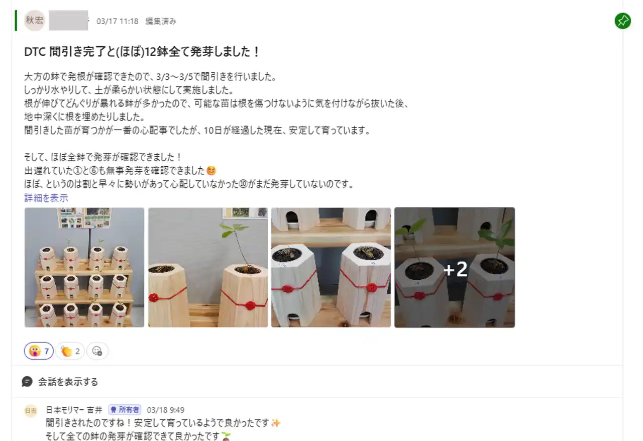 | 全国に分散する拠点を繋ぐため、社内コミュニケーションツール「Microsoft Teams」内に専用チャネルを開設。拠点ごとの成長記録や気づき、トラブルの解決策などをリアルタイムで共有します。このプロセスにより、部署や地域の垣根を超えたコミュニケーションを活性化させます。 | |||||||||