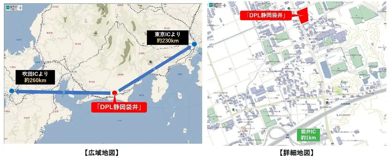 「DPL静岡袋井」は、東名高速道路「袋井インターチェンジ」より1km圏内(車で約5分)、新東名高速道路「森掛川インターチェンジ」より10km圏内(車で約40分)に位置し、東名・新東名ともに円滑にアクセスできる立地です。 |