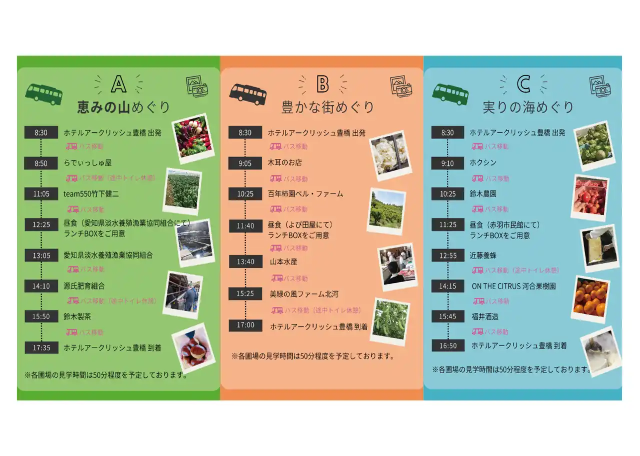 集合場所:ホテルアークリッシュ豊橋(愛知県豊橋市駅前大通一丁目55番地) 訪問先:各生産現場(圃場) |