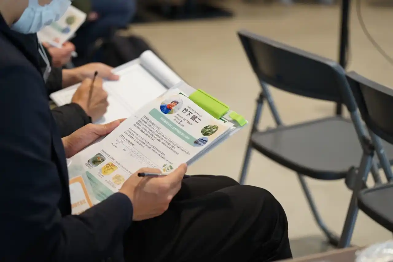 生産者それぞれが、栽培の工夫や食材の特徴などを紹介。参加者は真剣な表情で耳を傾け、メモを取りながら食材への理解を深めていました。 |