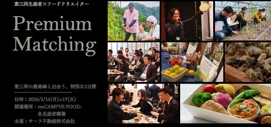 サーラ不動産株式会社(本社:愛知県豊橋市)は、2026年3月16日(月)・17日(火)に、東三河フードバレーの取り組みの一環として、東三河地域の生産者と、全国の料理人・バイヤー(以下「参加者」)をつなぐ体験型マッチングイベント「プレミアムマッチング会」(以下「本イベント」)を開催しました。 |