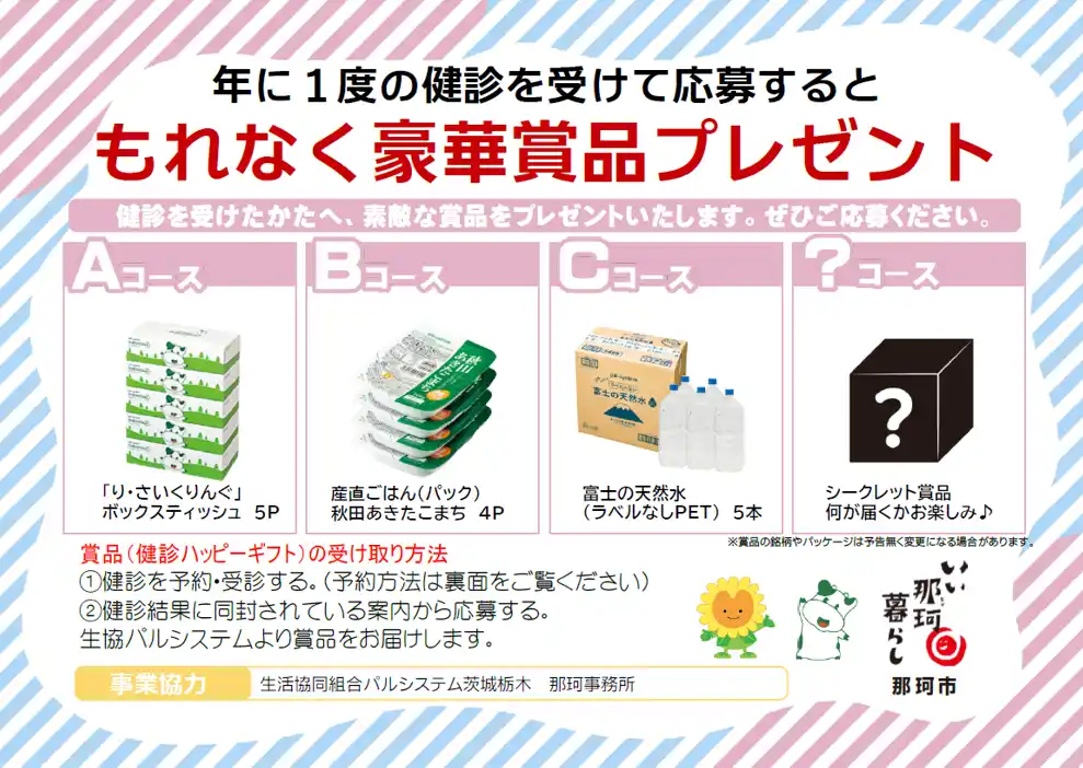 協定書に基づき那珂市は、血液検査や身体計測などが受けられる特定健康診査の案内時に「健診ハッピーギフト」の案内カードを配付します。希望者は健診の受診後、健診結果に同封する用紙から応募できます。 |