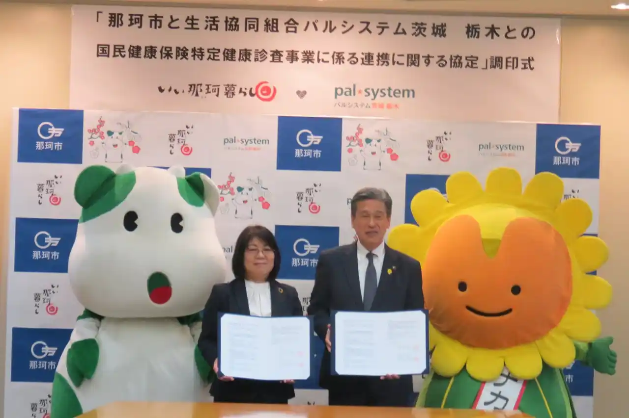 生活協同組合パルシステム茨城 栃木(本部:水戸市梅香、理事長:青木恭代)と那珂市(先崎光市長)は3月26日(木)、「国民健康保険特定健康診査事業に係る連携協定」を締結しました。健診事業で自治体が生協と連携を結ぶのは県内初めてです。協定書に基づき、那珂市国民健康保険に加入する健診対象者へごはんパックや天然水などから選べるギフトを届けます。行政と生協の協働により、地域住民の健康管理を推進します。 |