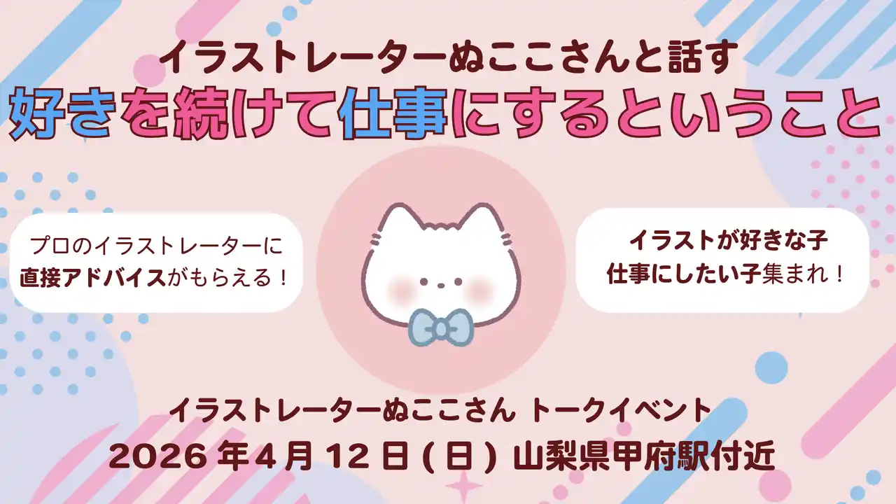株式会社NIJIN(本社:東京都江東区、代表取締役:星野達郎)が運営する不登校オルタナティブスクール「NIJINアカデミー」は、2026年4月12日(日)、人気イラストレーター・SNSクリエイターのぬここ氏をゲストに招いたリアルトークイベント「『好き』を続けて仕事にするということ」を山梨県にて開催いたします。 |