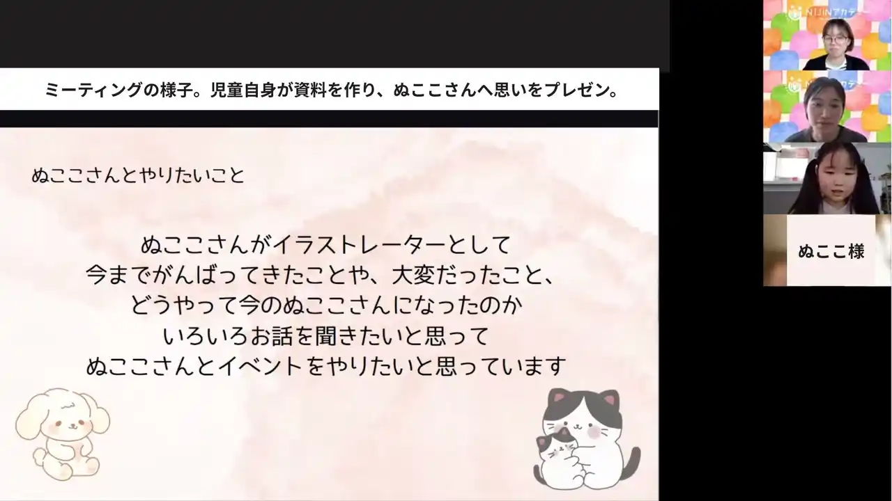 「いつか直接会って話を聞きたい」という夢を抱いた児童は、自ら出演依頼のメールを作成。その後、オンラインミーティングにてぬここ氏本人へ熱いプレゼンテーションを行い、本イベントの開催が決定しました。不登校という環境にあっても、自ら主体的に行動し、社会とつながることで新たな機会を創出した事例となります。 |