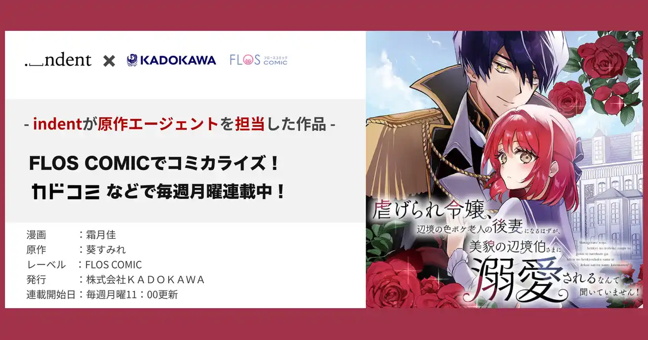 65万人を超える作家と企業をつなぐ創作プラットフォーム「Nola(ノラ)※1」を提供する株式会社indent(本社:東京都千代田区、代表取締役社長:釜形勇気 以下、「indent」)は、indentが原作エージェントを担当した『虐げられ令嬢、辺境の色ボケ老人の後妻になるはずが、美貌の辺境伯さまに溺愛されるなんて聞いていません!』(漫画:霜月佳 原作:葵すみれ、レーベル:FLOS COMIC、発行:株式会社KADOKAWA)のコミカライズ作品が、2026年3月16日(月)より、株式会社KADOKAWA(本社:東京都千代田区、取締役 代表執行役社長 CEO:夏野剛)と株式会社ドワンゴ(本社:東京都中央区、代表取締役社長:夏野剛)が運営する漫画サイト「カドコミ」ほかにて連載が開始されましたことをお知らせいたします。 |