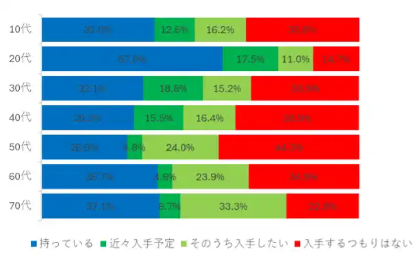 「自転車用のヘルメットを持っていますか?」に対し、「持っている」人は36.4%でした。「持っていないが近々入手を予定している」11.0%、「持っていないがそのうち入手したい」21.4%で、32.4%が今後自転車用ヘルメットを入手したい意向であることがわかりました。所持率が最も高いのは20代(57%)で、最も低いのは50代(26.9%)でした。 |