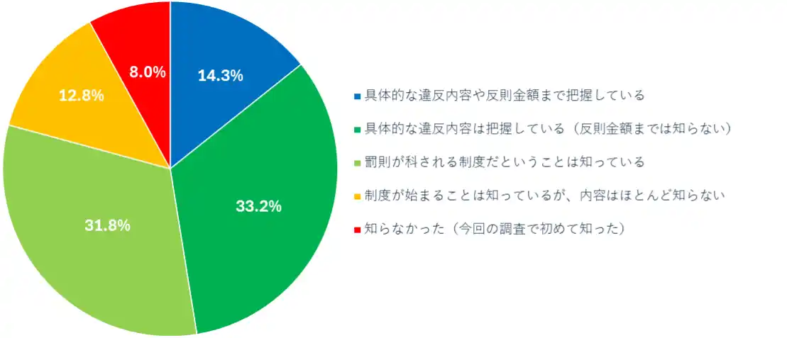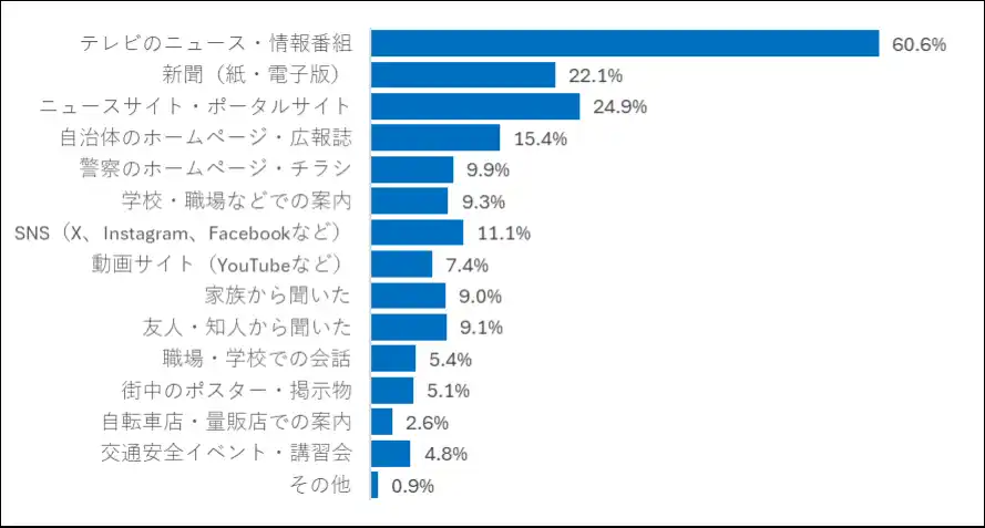 「青切符適用について、あなたに最も近いものを教えてください。」に対し、「具体的な違反内容や反則金額まで把握している」14.3%、「具体的な違反内容は把握している(反則金額までは知らない)」33.2%で、具体的な違反内容を把握しているのは47.5%でした。制度開始の認知は92%と高く、情報源はテレビのニュース・情報番組などメディアが上位を占めました。 |