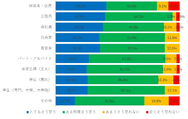 「青切符適用を知ってから、自転車の交通安全に対する意識が高まりましたか?」に対し、「とてもそう思う」30.2%、「ある程度そう思う」55.1%で、安全意識が高まった人が85.3%にのぼりました。職業別では、「とてもそう思う」と回答した割合が最も高かったのは経営者・役員(40.9%)、次いで公務員(40%)でした。 |