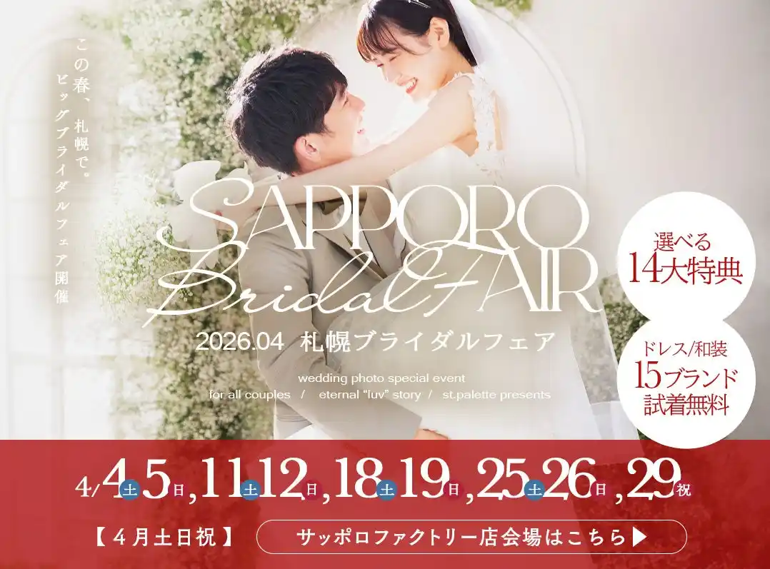 この度、2026年4月土日祝限定で、お得で楽しいブライダルフェアを札幌エリアの店舗で開催します。運命の一着を探している方、憧れのドレスを試着したい方は、この機会にぜひご来店ください。 |