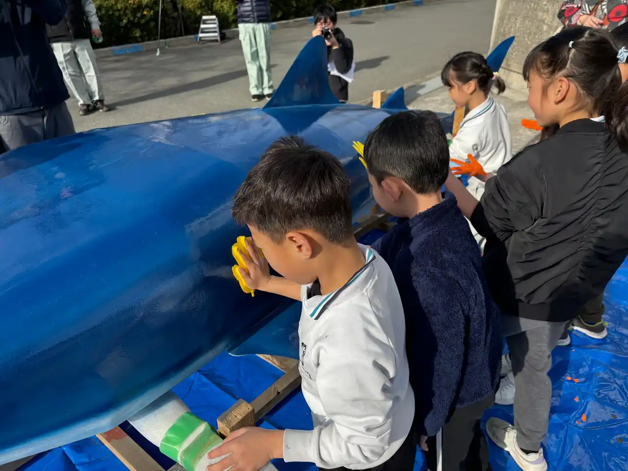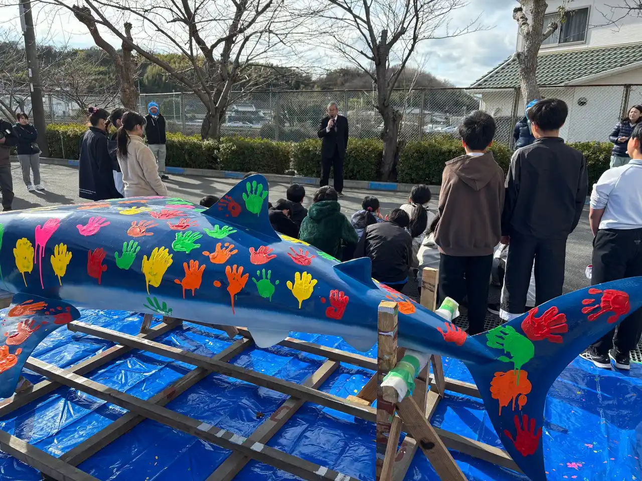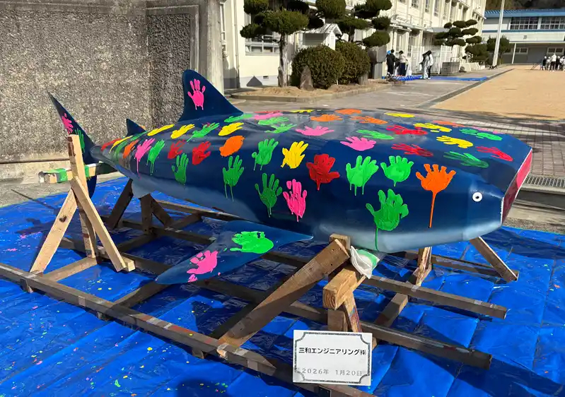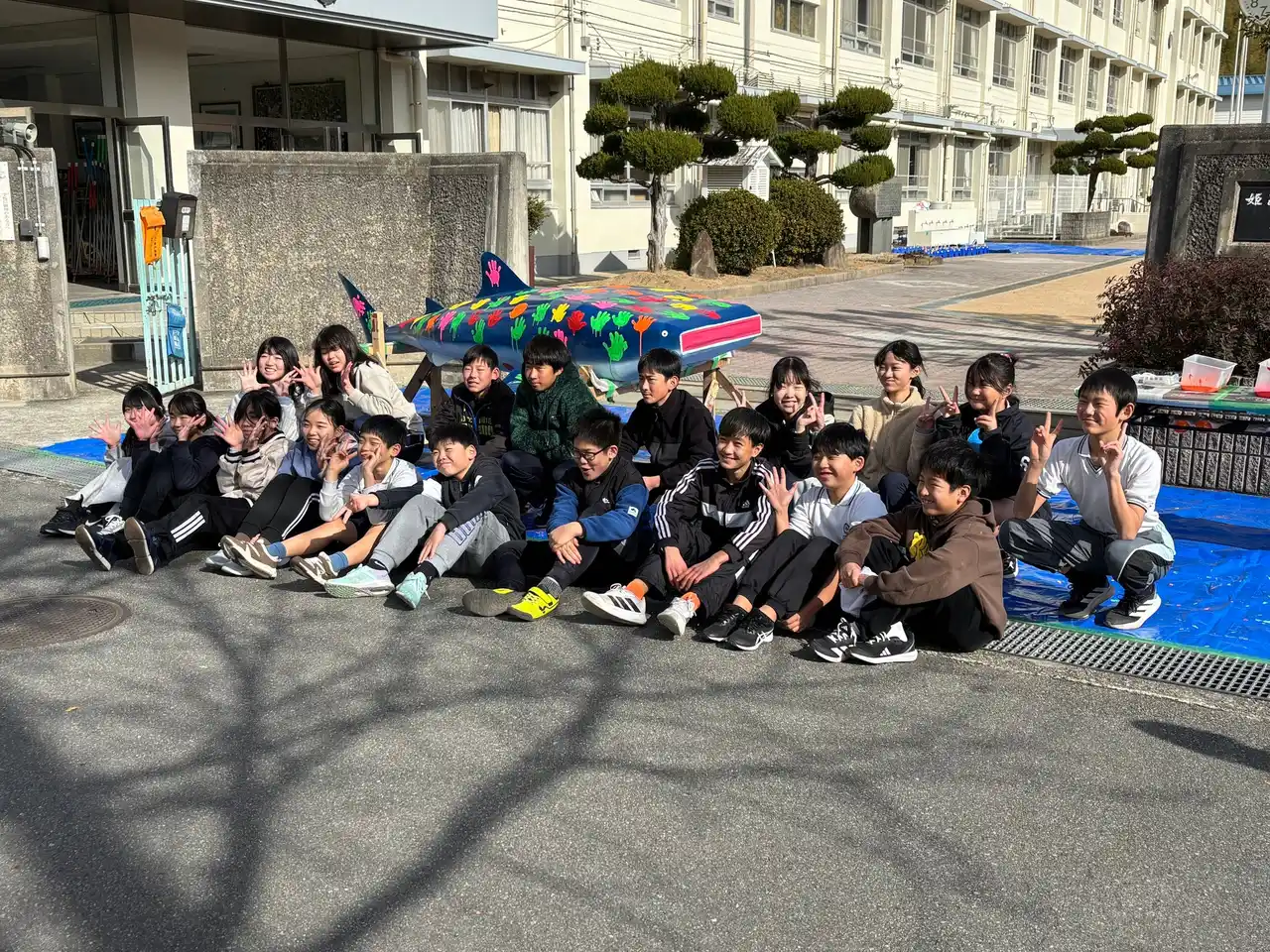 さる1月20日(火)9:30~12:00、姫路市立八木小学校にて、当社の若手社員が設計・製造した全長約2.5メートルの「鉄の巨大ジンベイザメ」のオブジェに、姫路市立八木小全生徒(約90名)が色とりどりの絵の具で手形をつけ、とても素敵に完成させてくれましたので報告します。 |