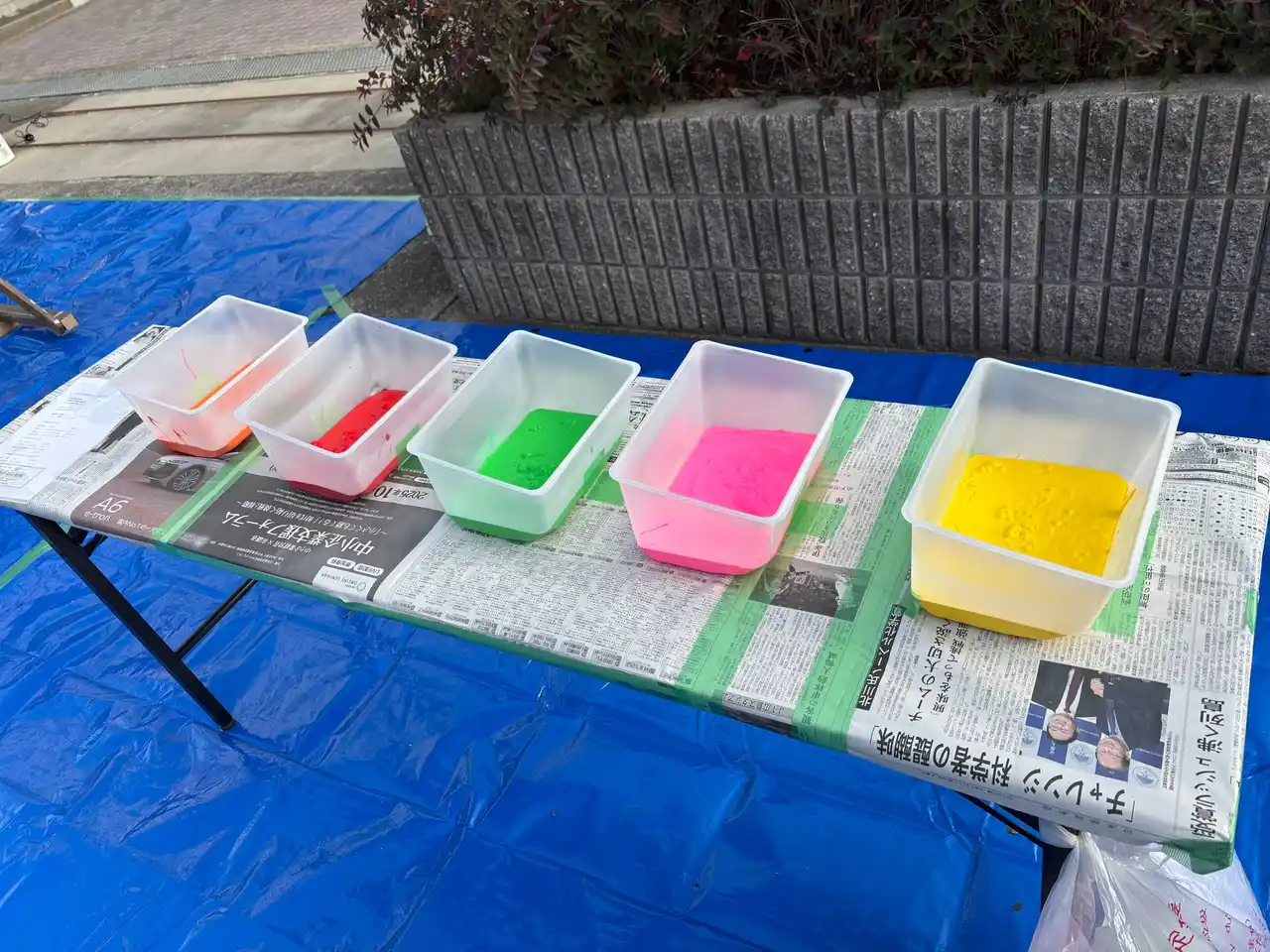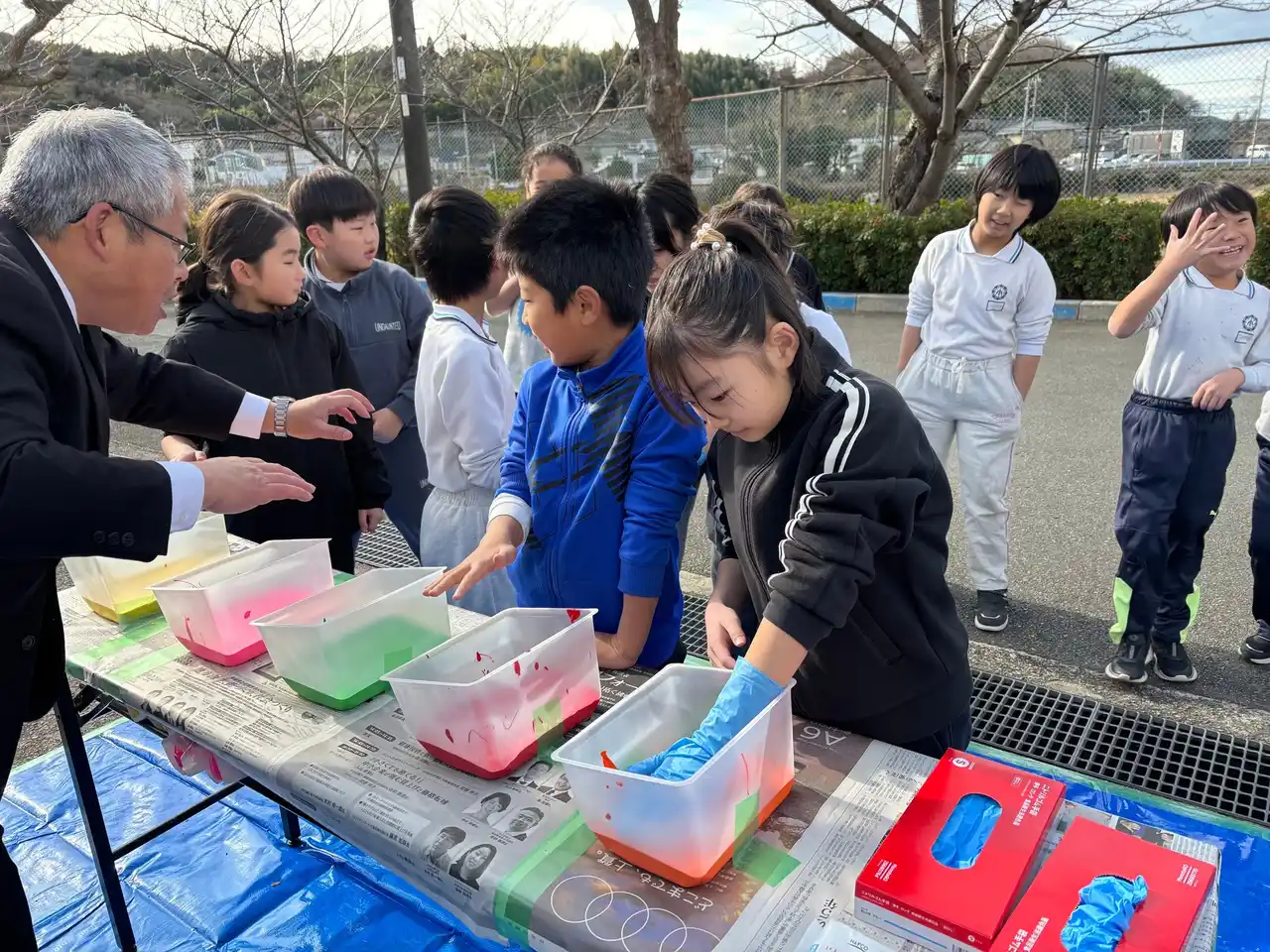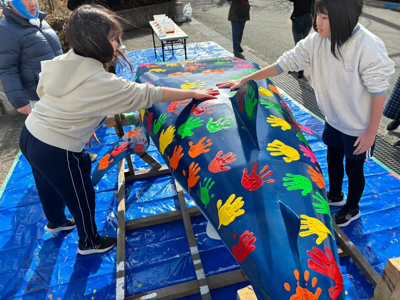 9:50 1年生から5年生までが順次、1人ひとりが好きな色を選んで手形をつけていきました |