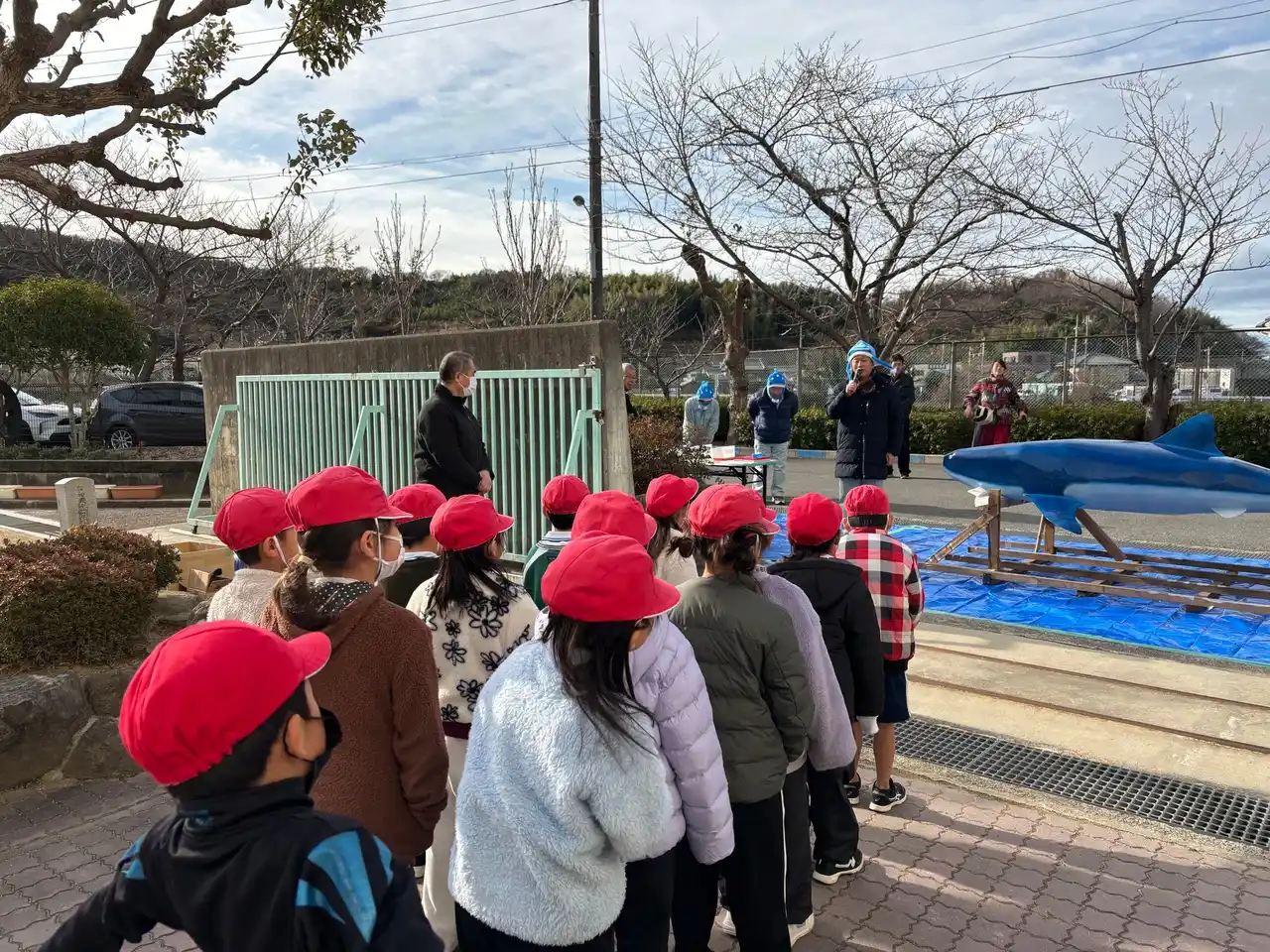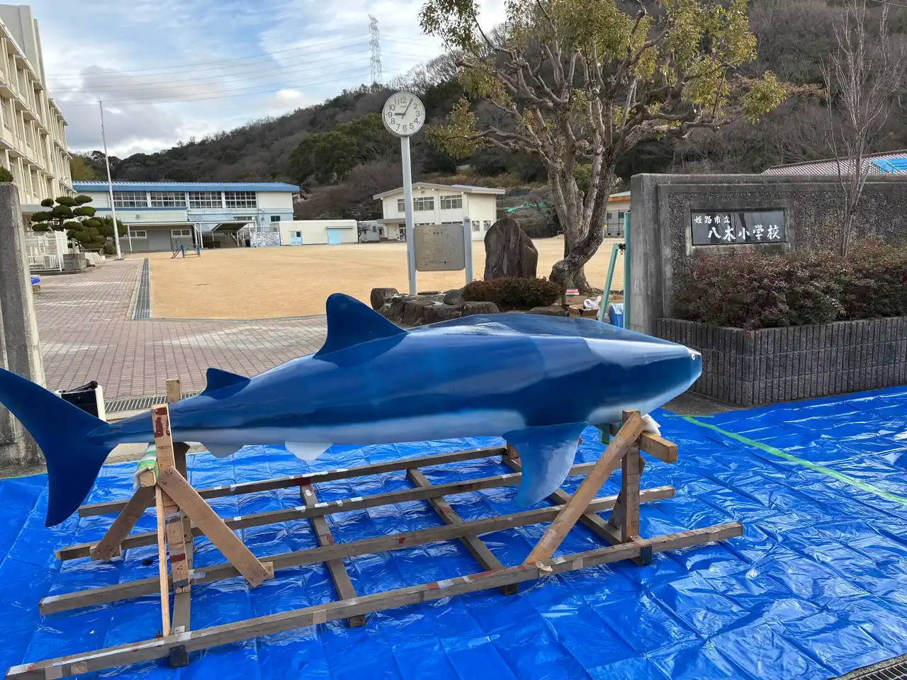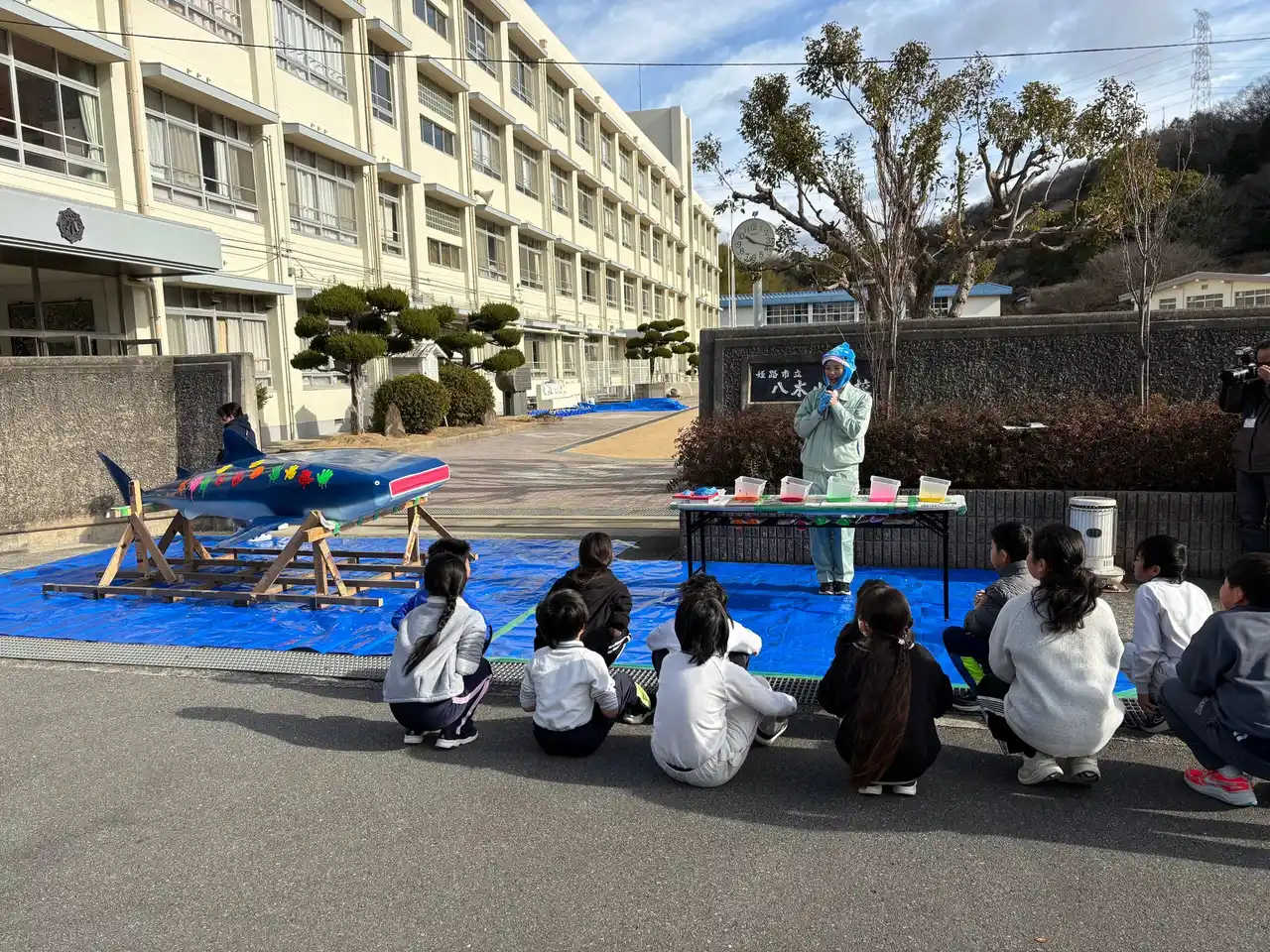 8:30 ジンベイザメオブジェが八木小学校前に到着、イベント準備を開始 |