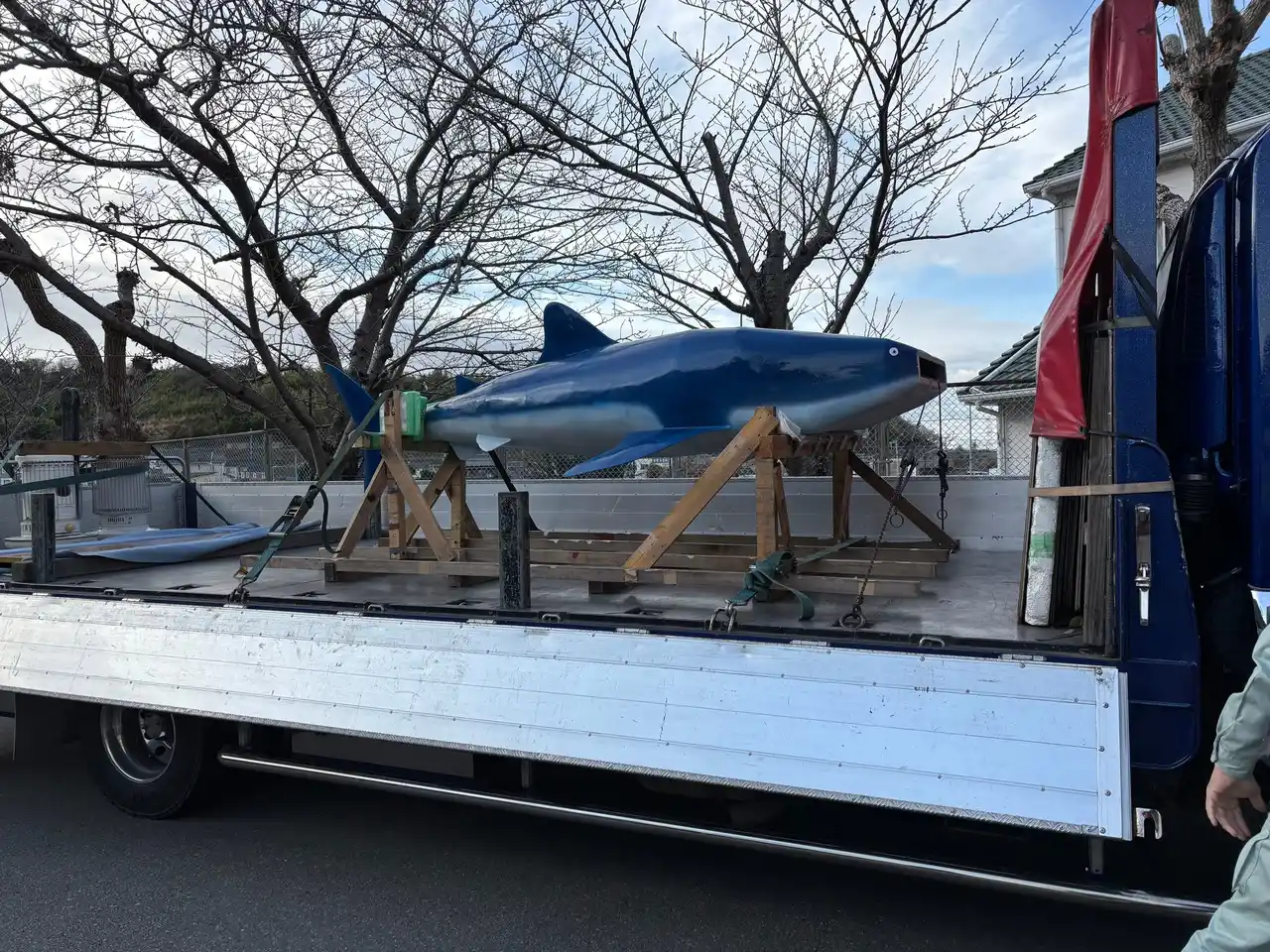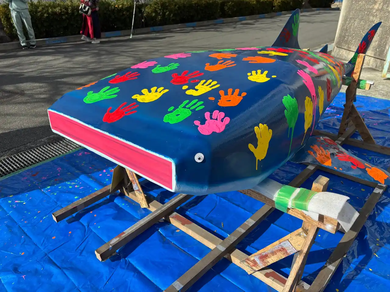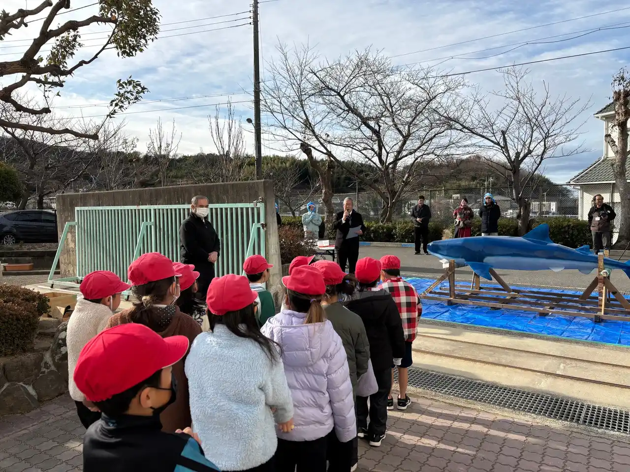 8:30 ジンベイザメオブジェが八木小学校前に到着、イベント準備を開始 |