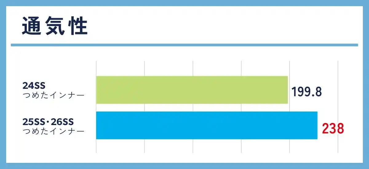 薄手のメッシュ素材を採用し、当社従来品(2024年発売)と比較して1.4倍以上の通気性を実現。熱がこもりにくく、運動中も涼しさが継続します。 |
